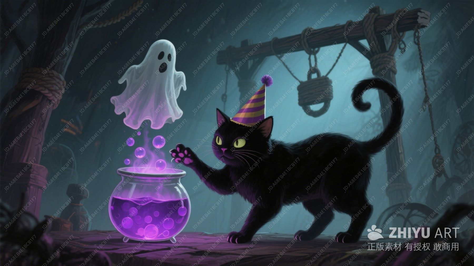 万圣节夜景:黑猫与糖果罐中的幽灵