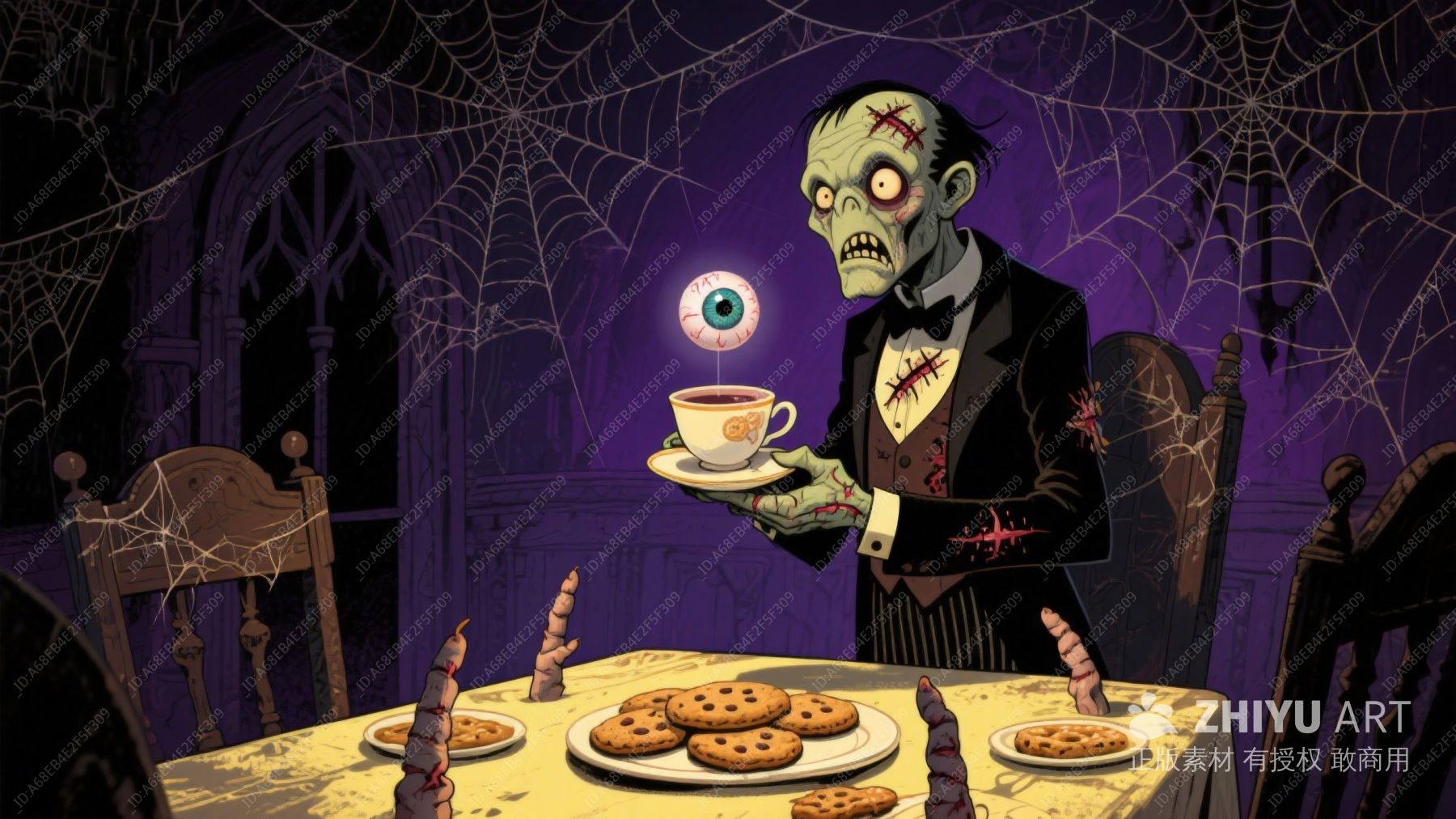 僵尸管家端着恐怖饮品迎接万圣节