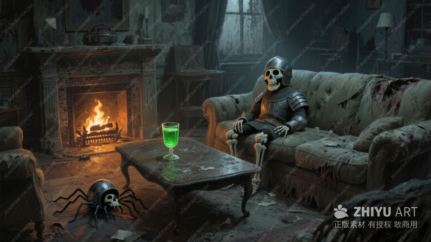 骷髅骑士在破旧客厅中休息
