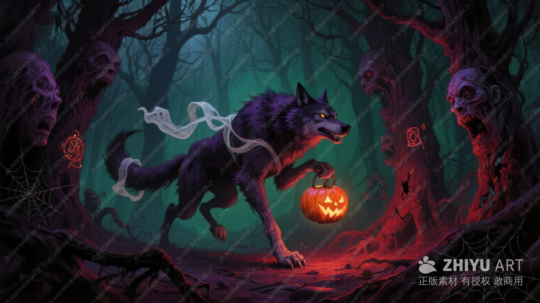 狼人手持南瓜灯,幽灵相伴森林夜景