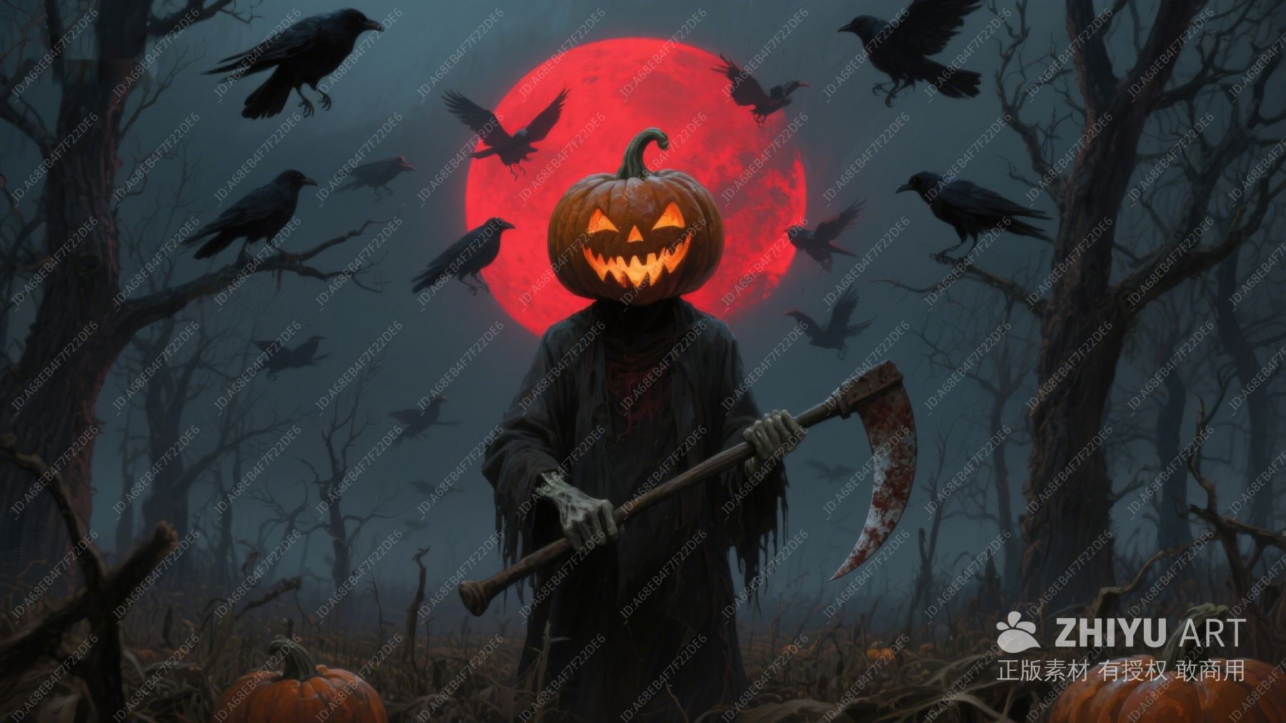 南瓜头幽灵手持镰刀,月夜森林恐怖场景