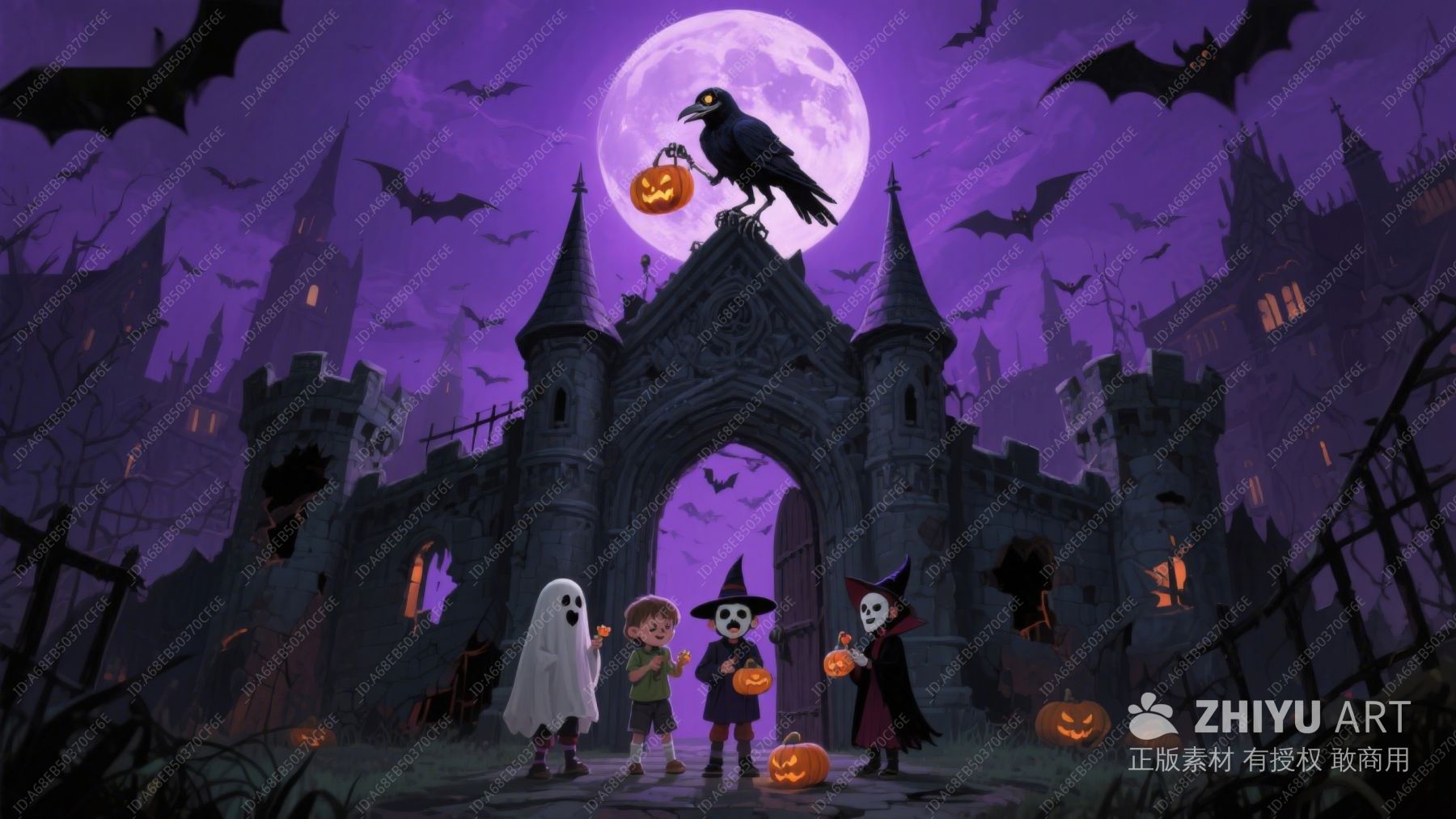 万圣节幽灵与小丑在城堡前的欢乐夜