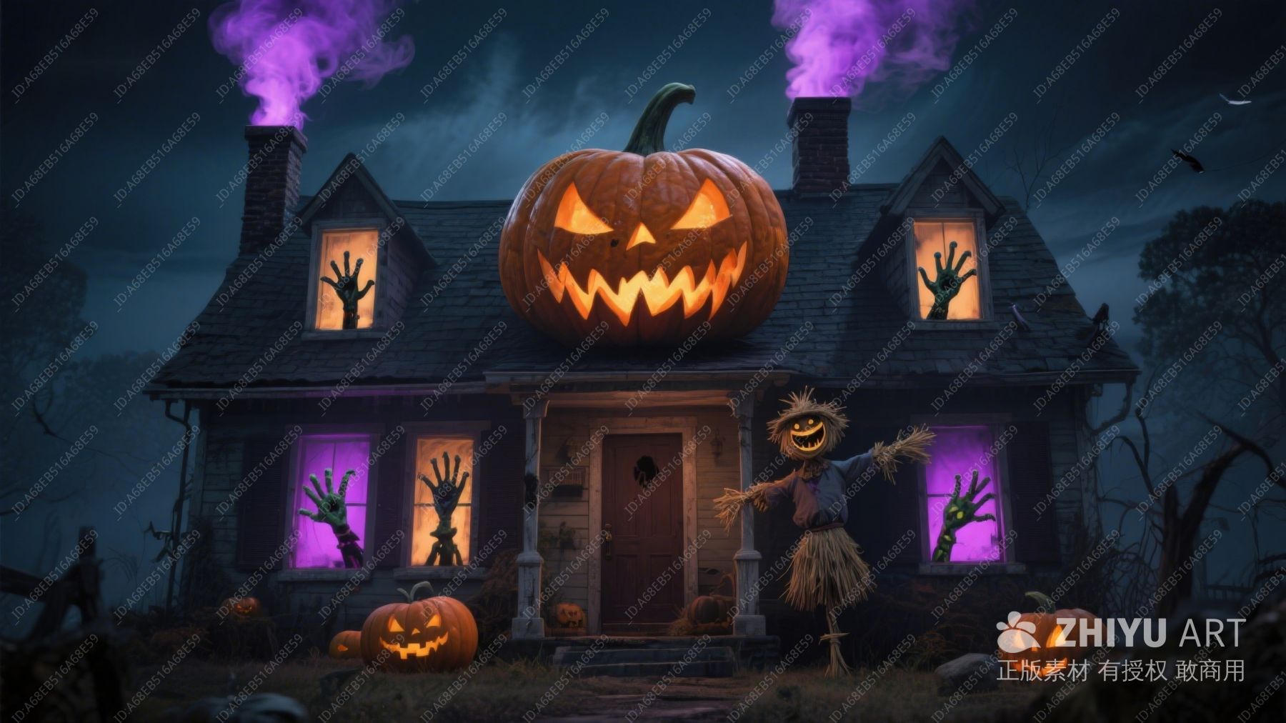 万圣节南瓜灯与幽灵屋的欢乐夜景