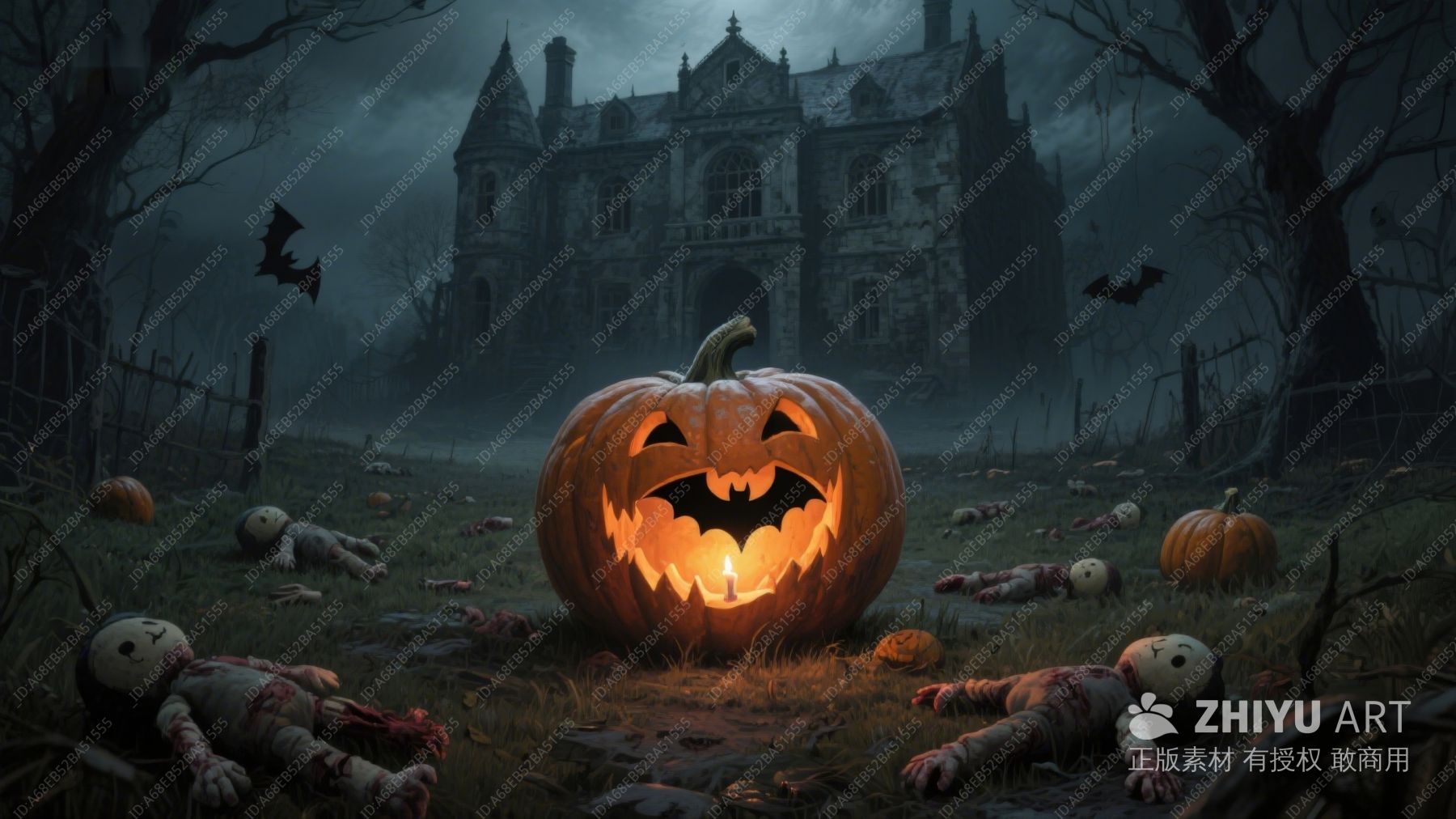 万圣节夜景:南瓜灯与幽灵蝙蝠