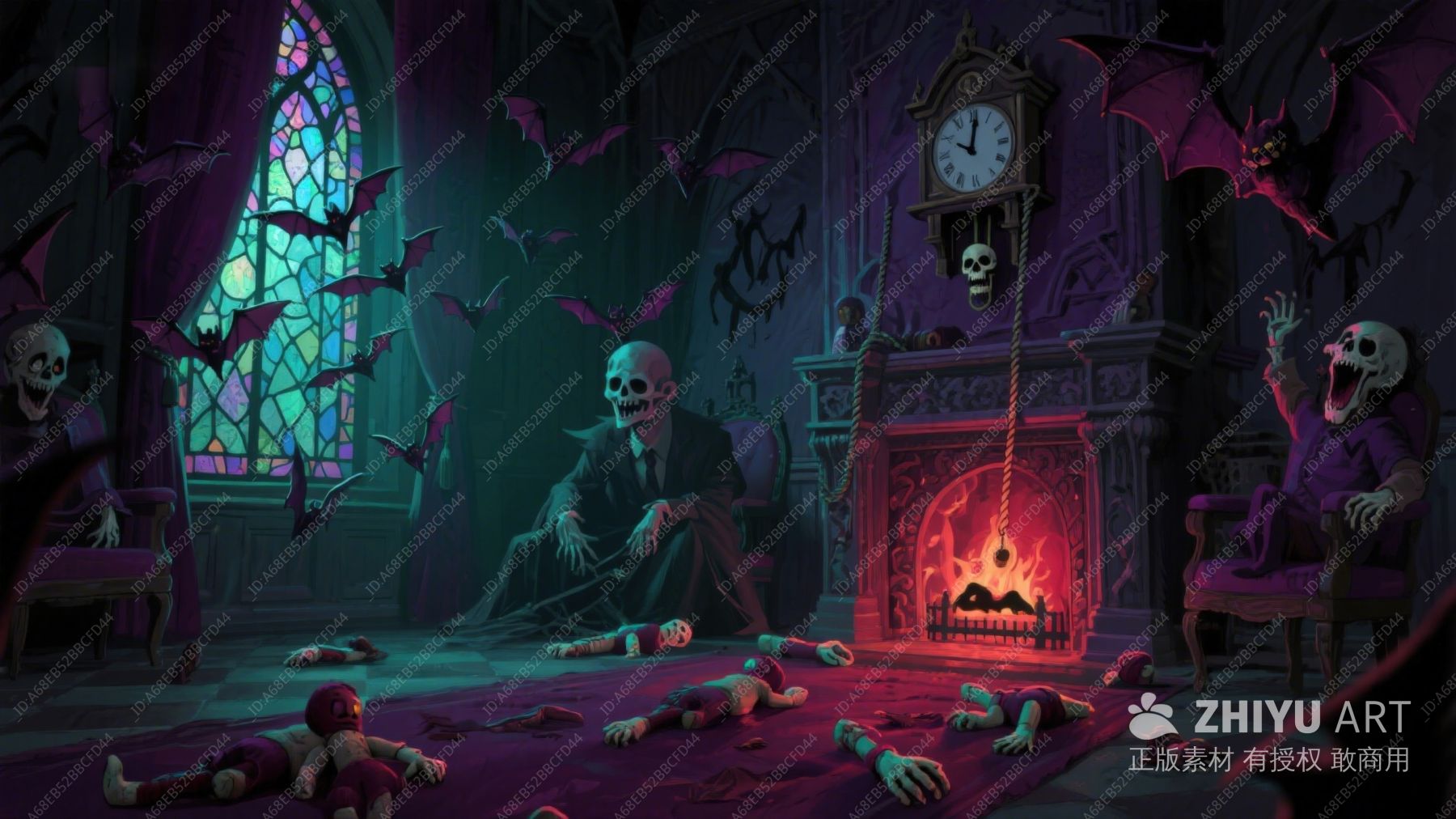 幽暗古堡楼梯上的骷髅与蝙蝠