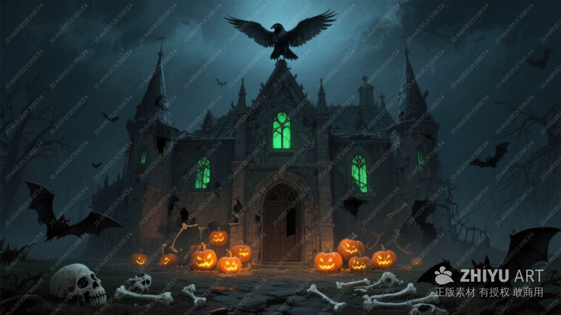 万圣节夜景:幽灵城堡与骷髅