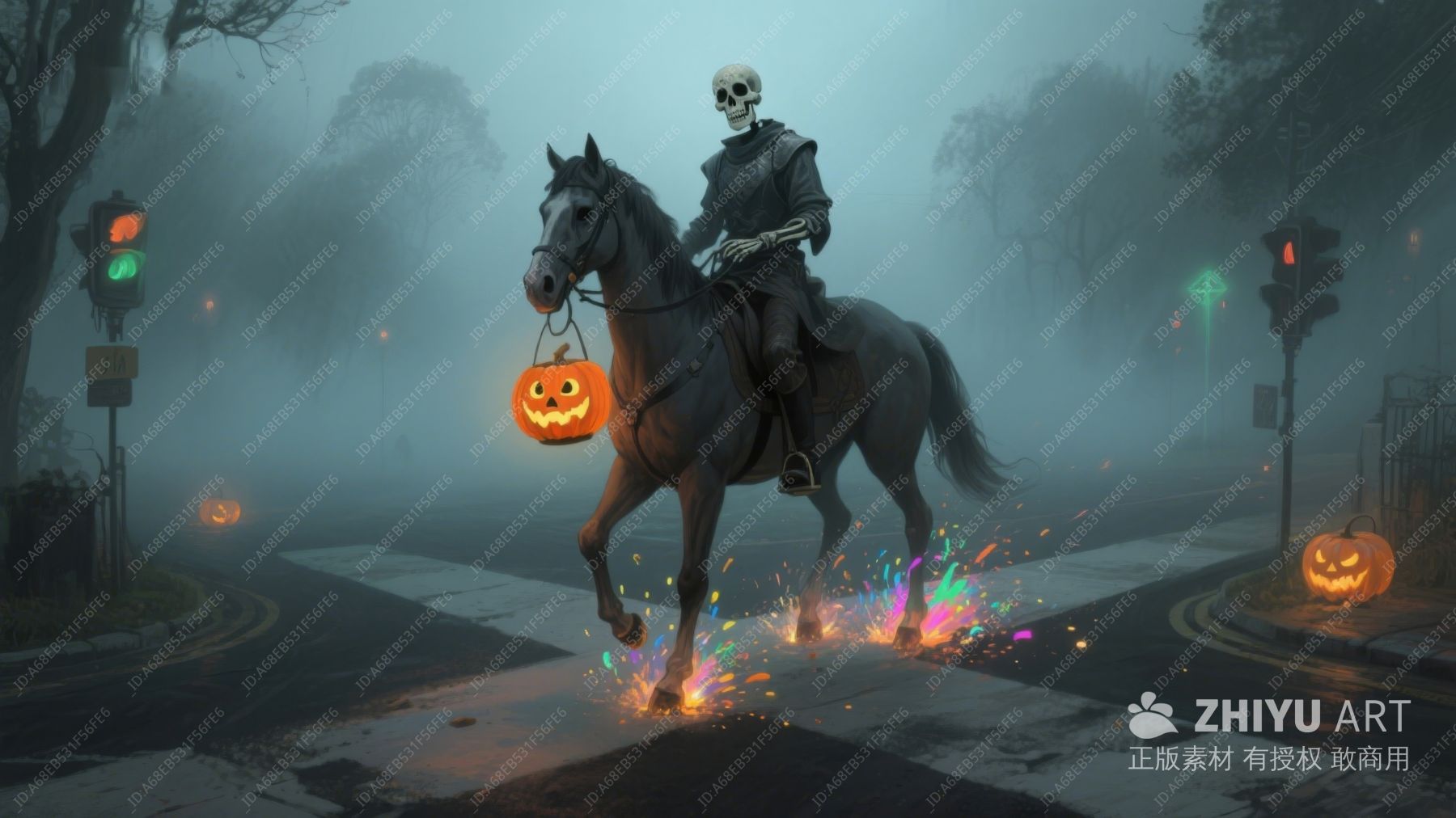 幽灵骑士夜行,南瓜灯照亮迷雾街道