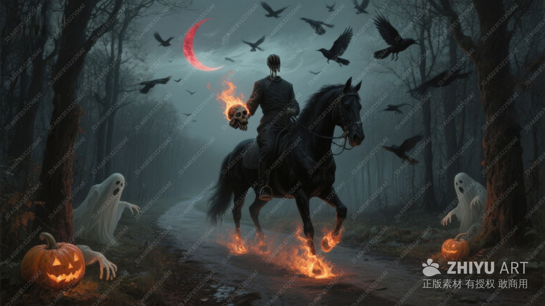 幽灵骑士夜行,南瓜灯照亮迷雾街道