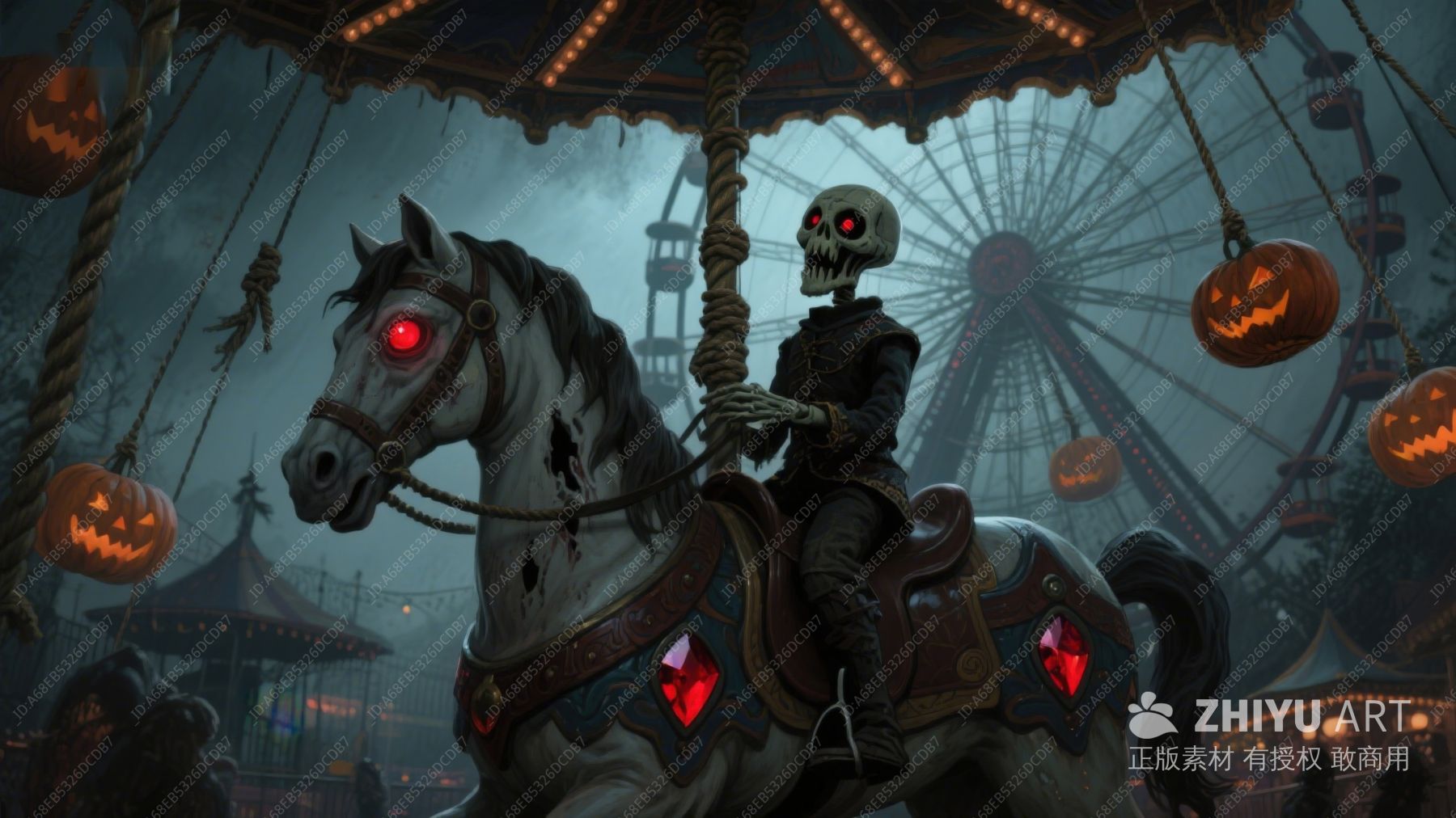 幽灵骑乘旋转木马,万圣节氛围浓厚