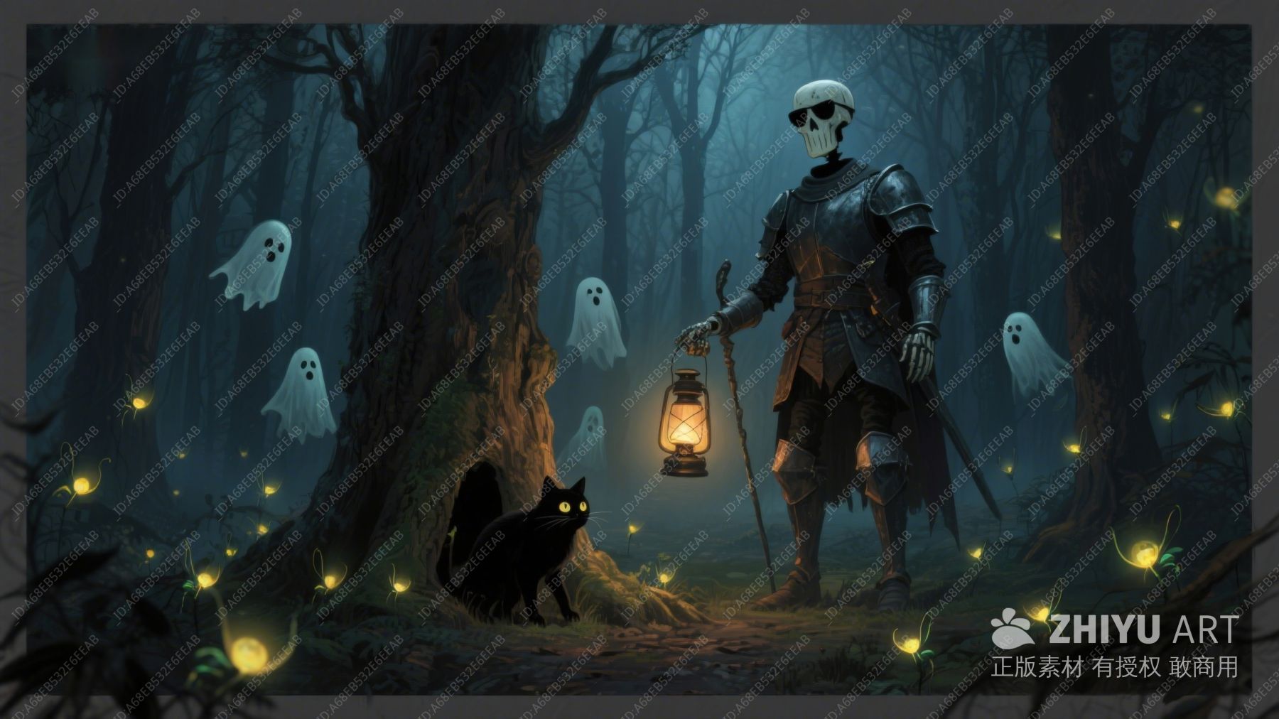万圣节夜森林中的骷髅与幽灵