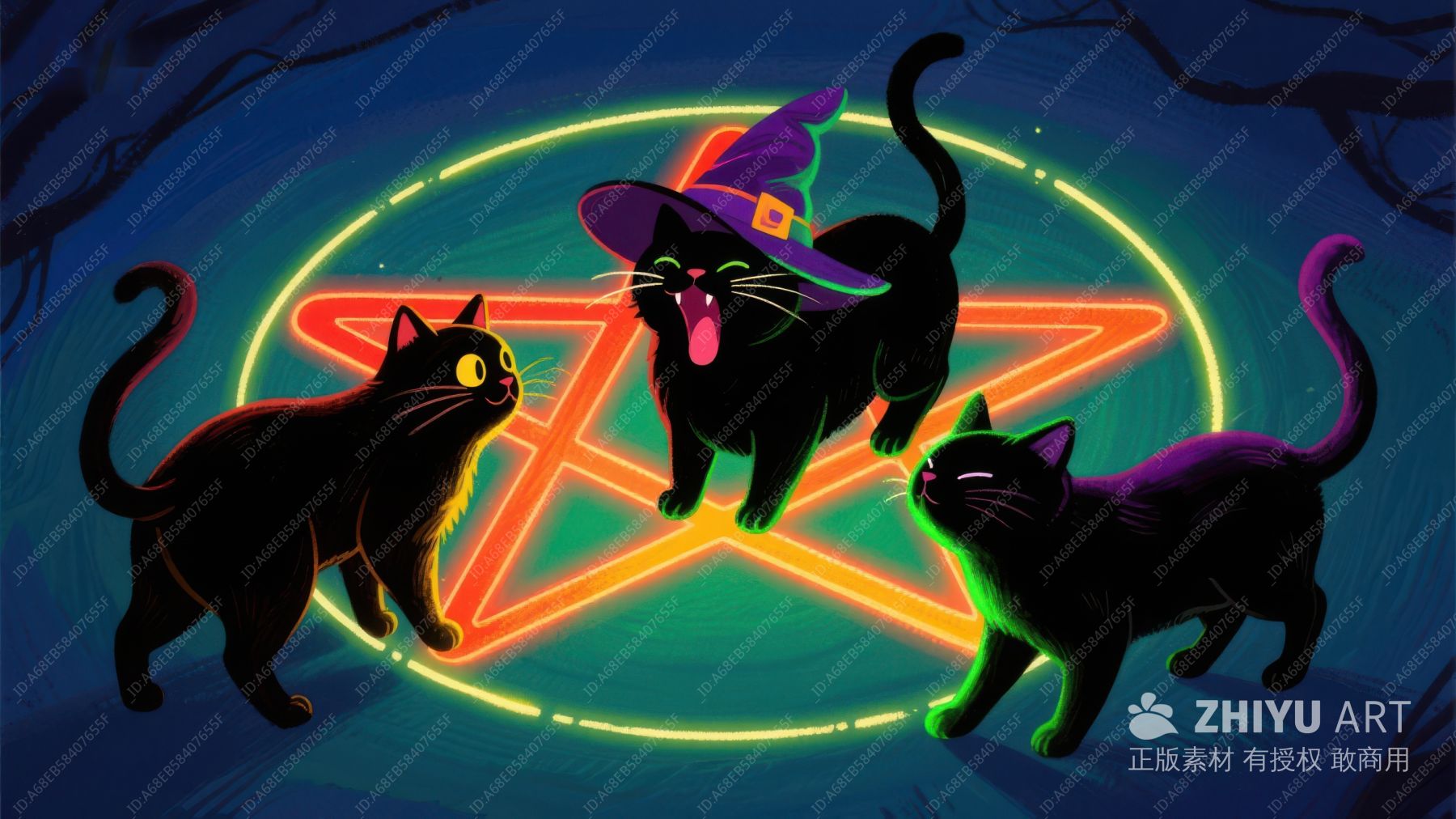 黑猫屋顶静坐,闪电夜空巫帽飞舞