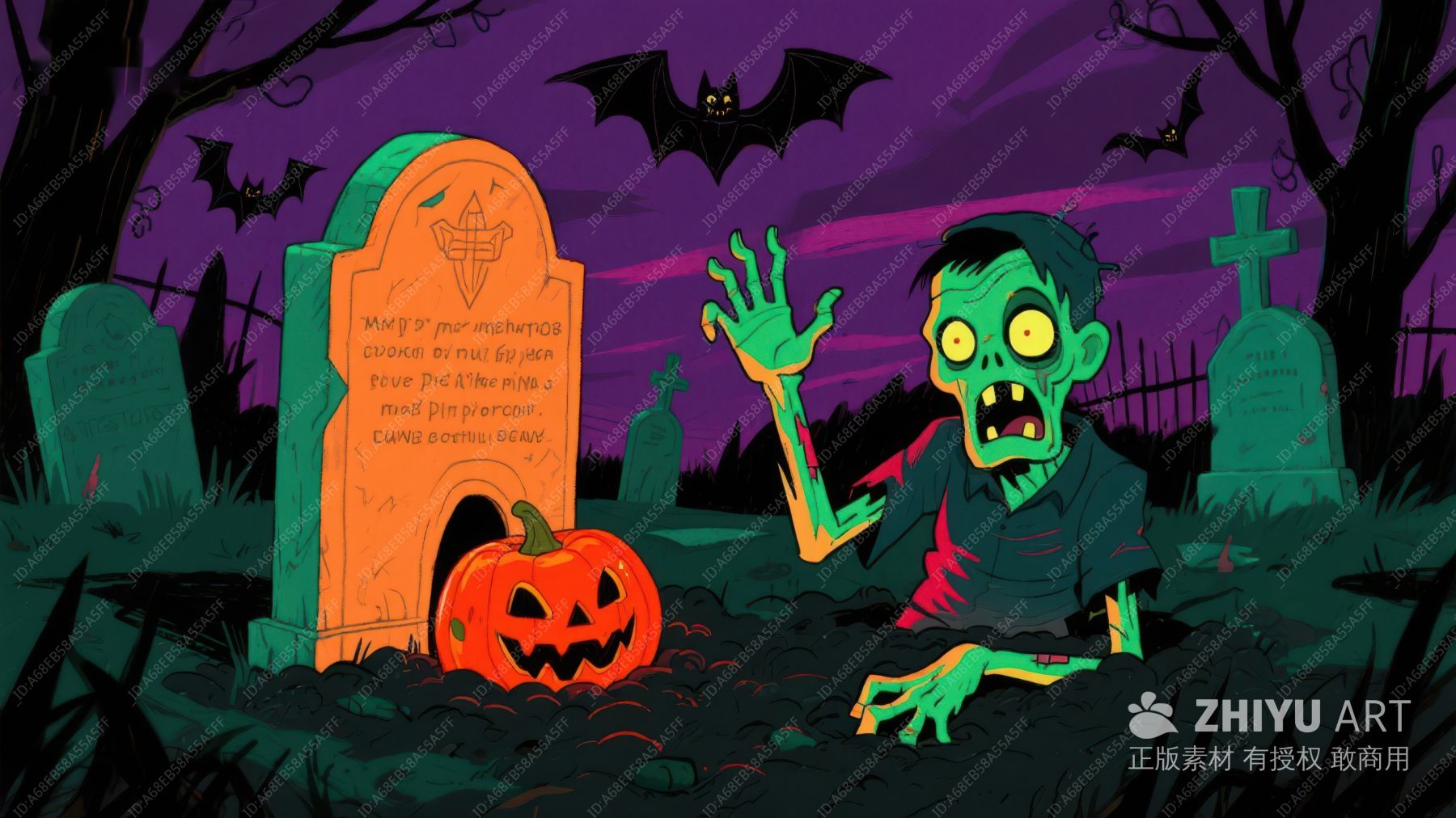 万圣节墓地场景:骷髅、幽灵与南瓜灯