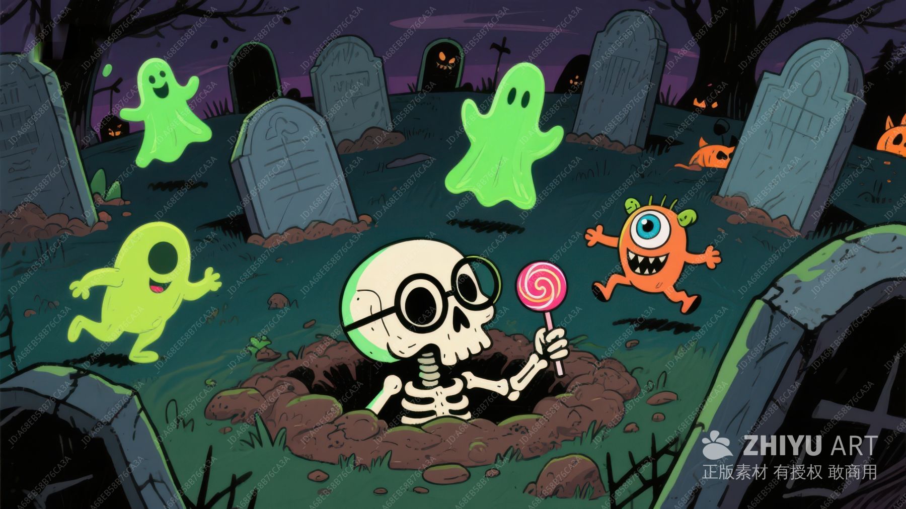 墓地万圣节场景:骷髅与幽灵的搞笑互动