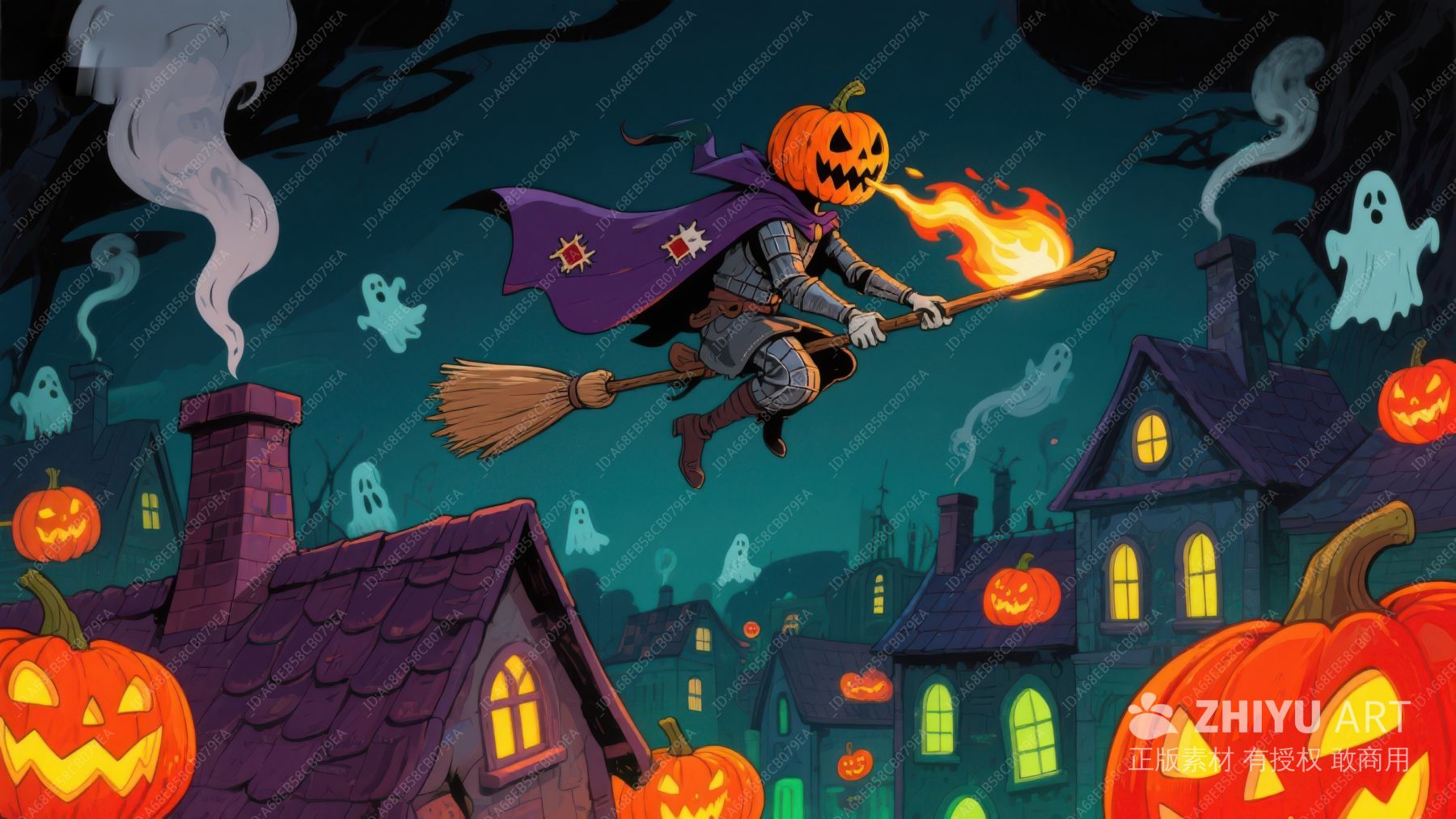 南瓜头巫师手持扫帚,夜空蝙蝠飞舞