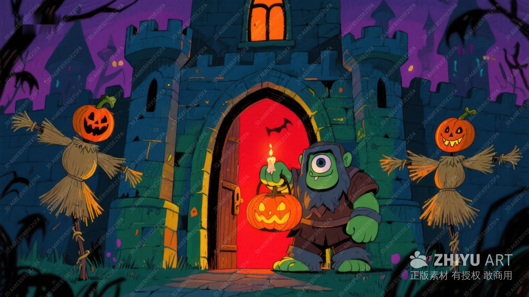 万圣节城堡夜景,南瓜灯与蝙蝠环绕