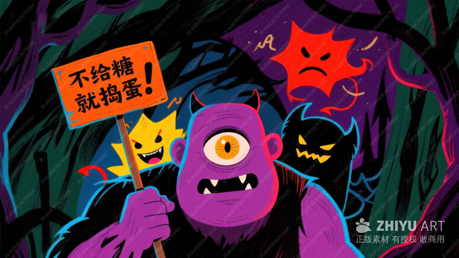 万圣节幽灵手持“不给糖就捣蛋”标语