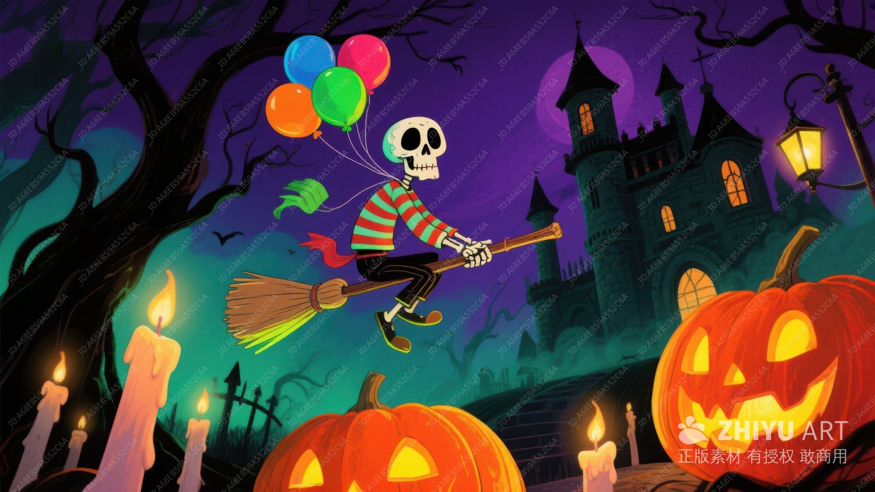 万圣节骷髅骑扫帚,背景城堡与南瓜灯
