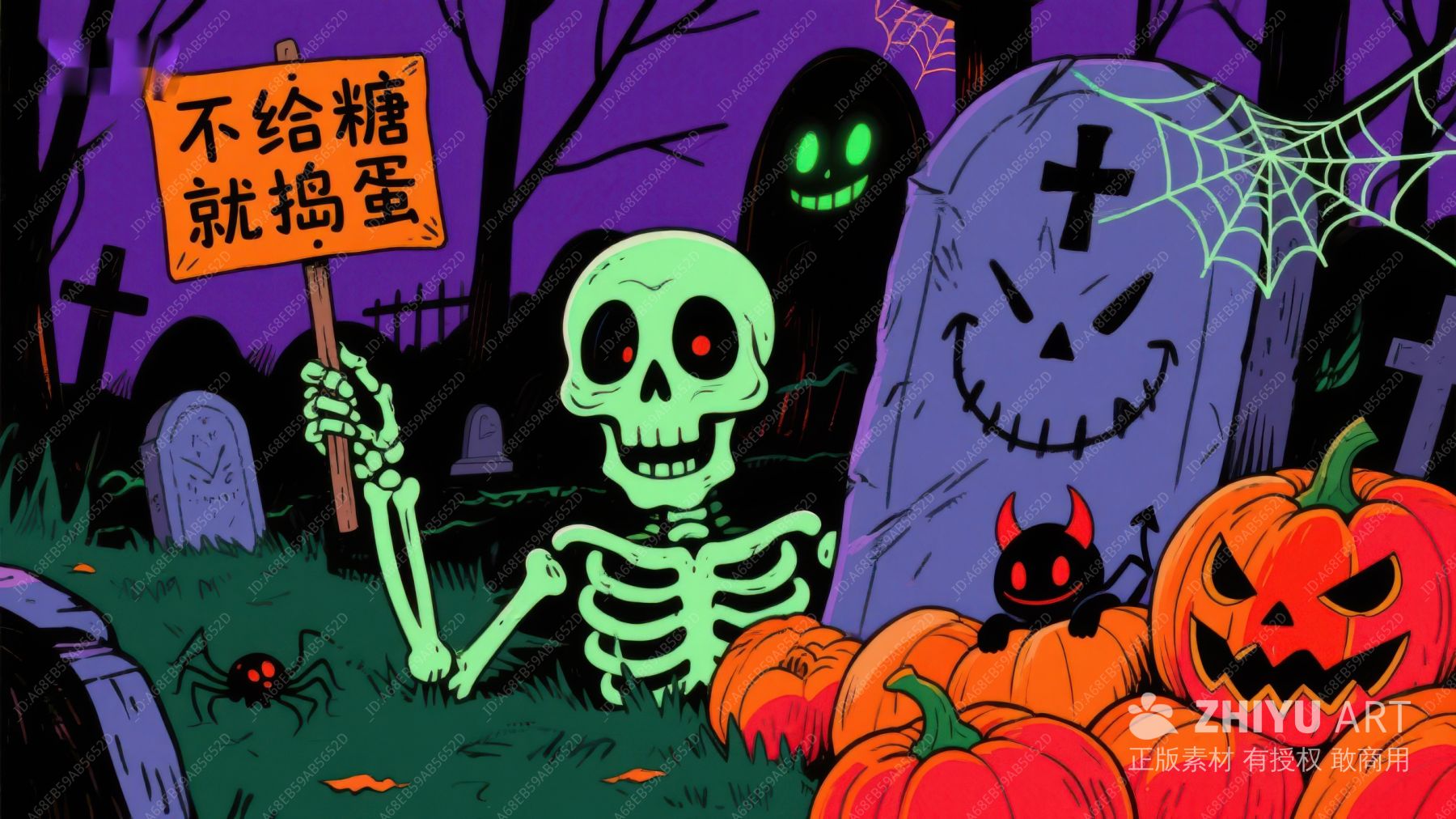 万圣节骷髅举牌,墓地幽灵南瓜灯