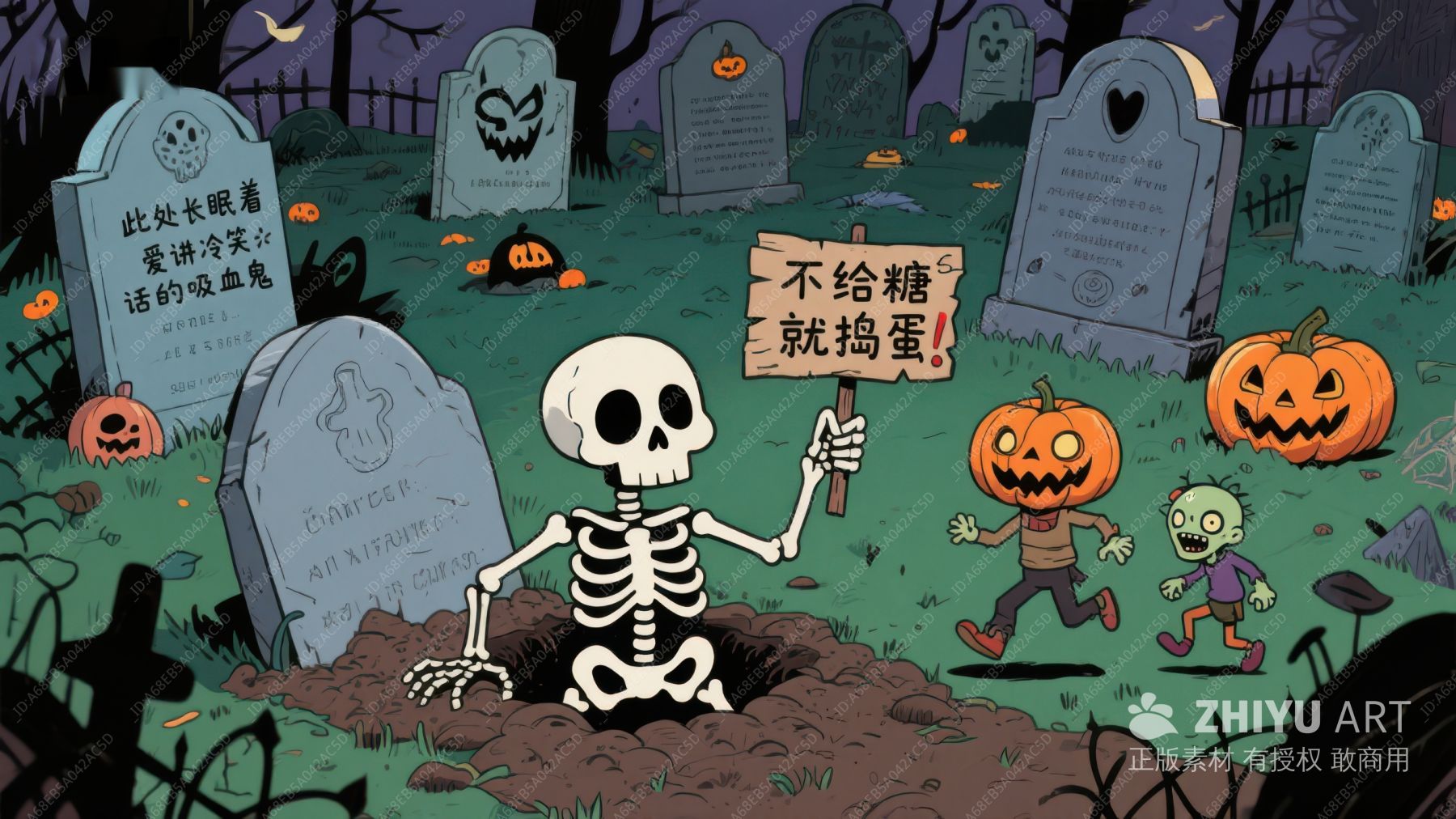 万圣节骷髅举牌,墓地幽灵南瓜灯