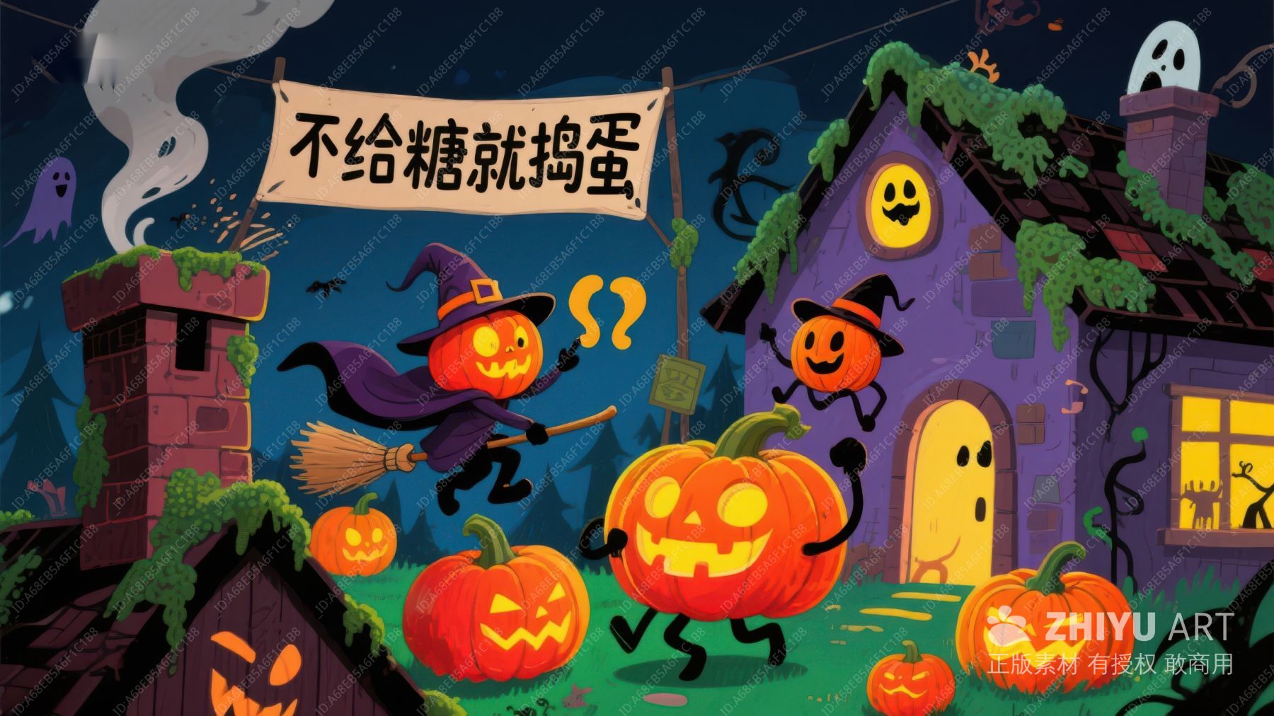 万圣节南瓜灯与幽灵屋的欢乐夜景