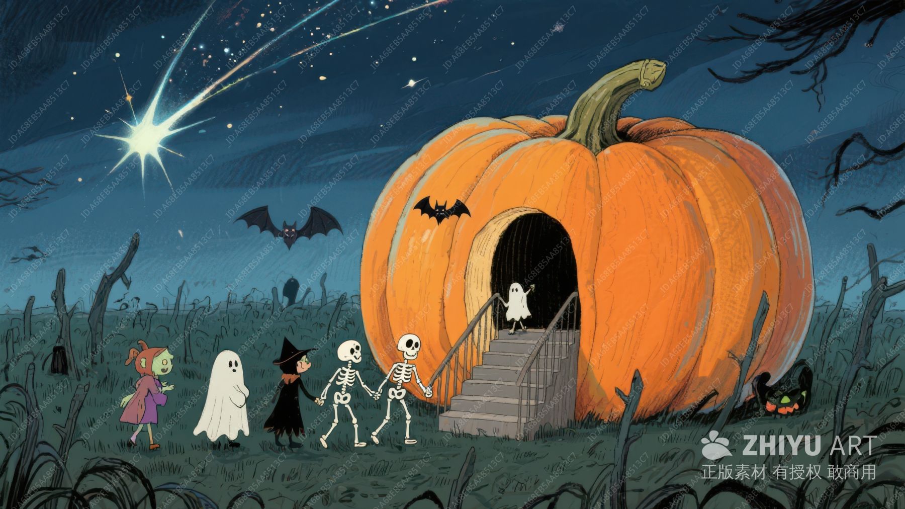 万圣节南瓜屋前的欢乐场景