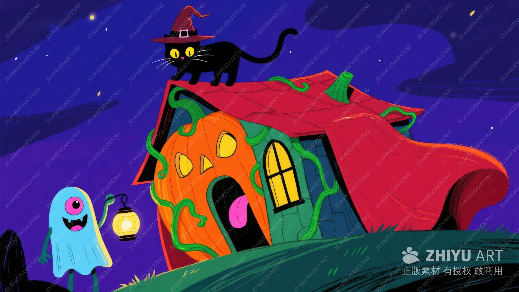 万圣节夜景:南瓜、幽灵与蜘蛛的奇幻冒险