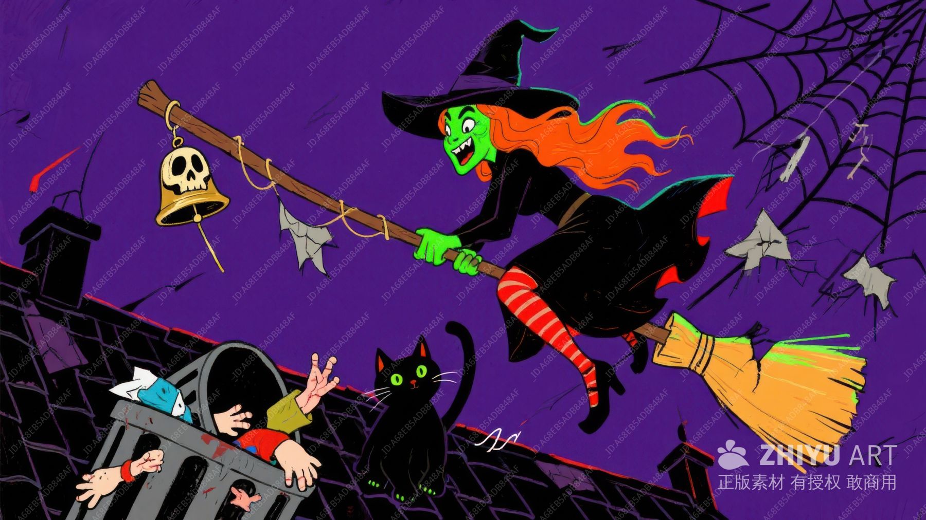 万圣节女巫骑扫帚吸尘屋顶