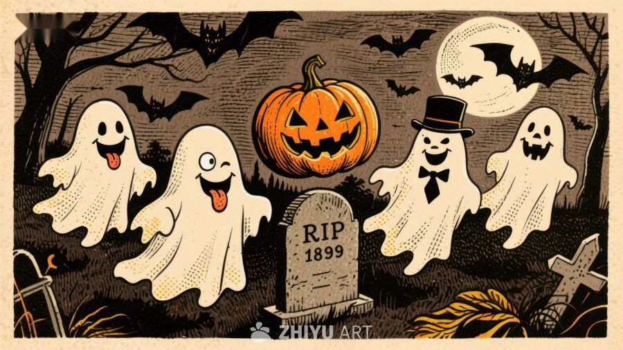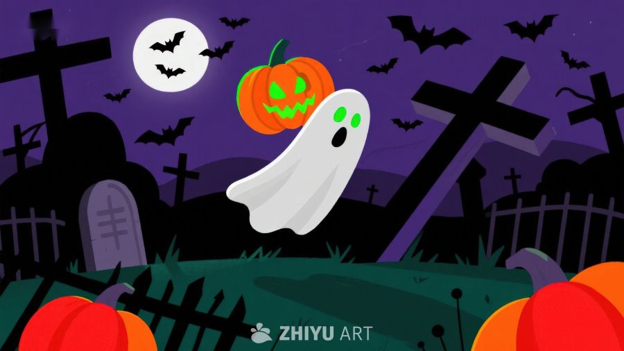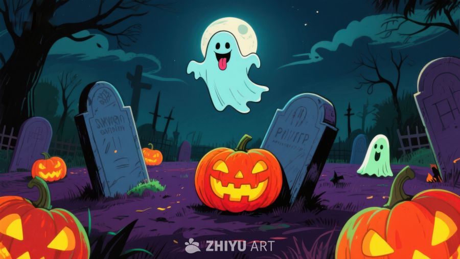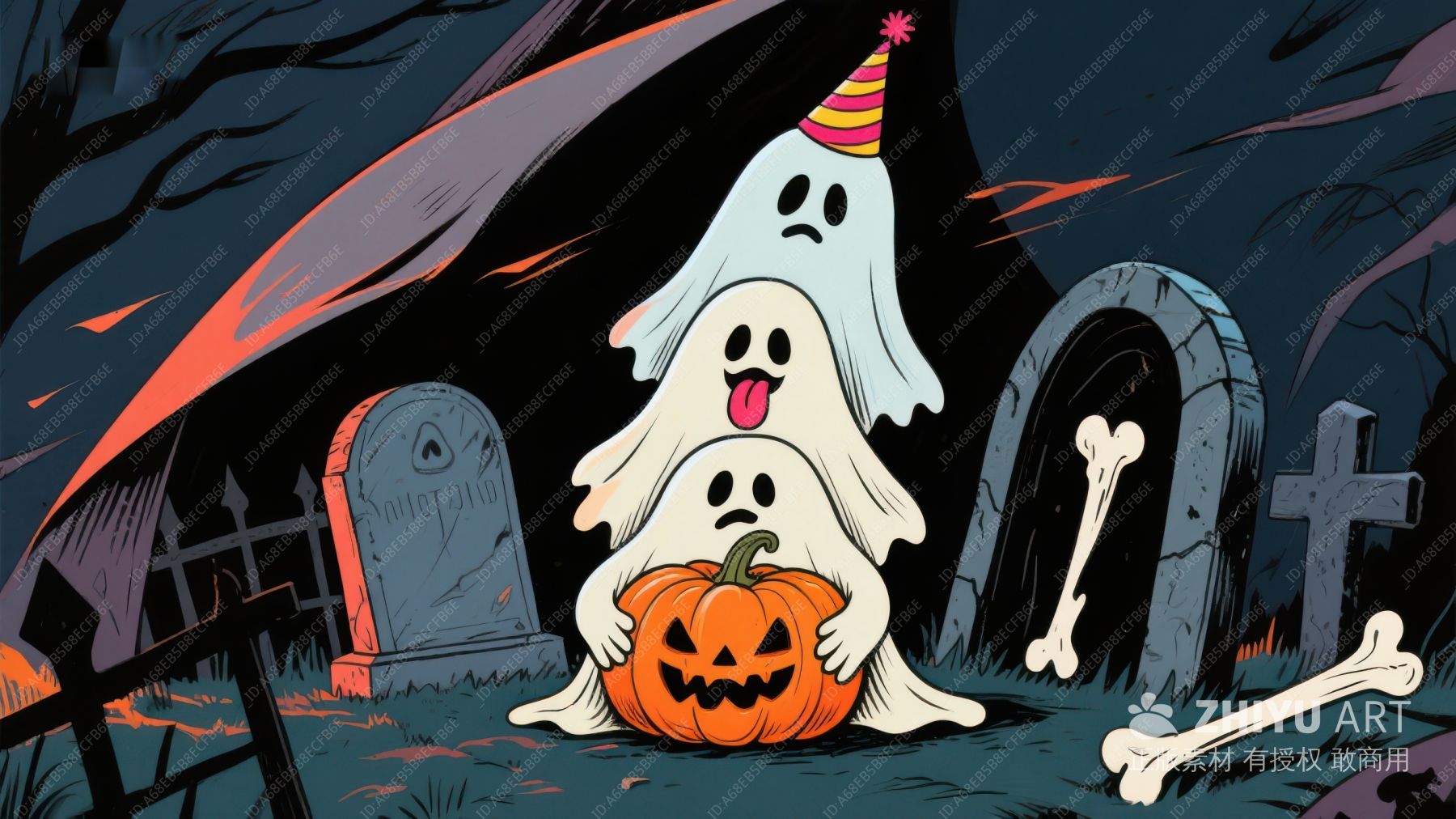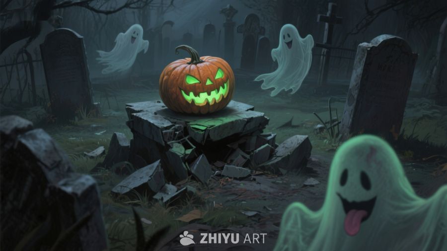 万圣节墓地场景:骷髅、幽灵与南瓜灯