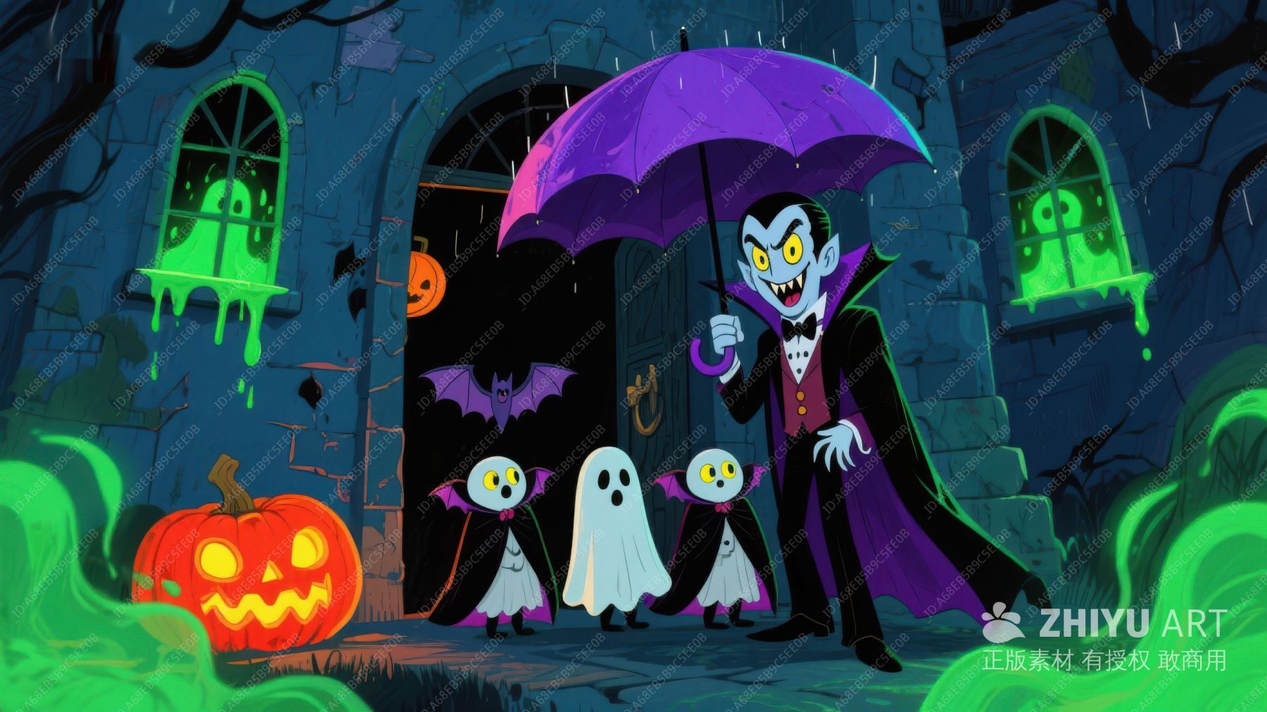 万圣节夜,吸血鬼与小幽灵在古堡前