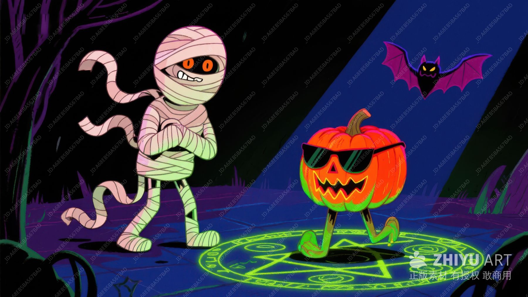 万圣节夜景:木乃伊、南瓜灯与巫师