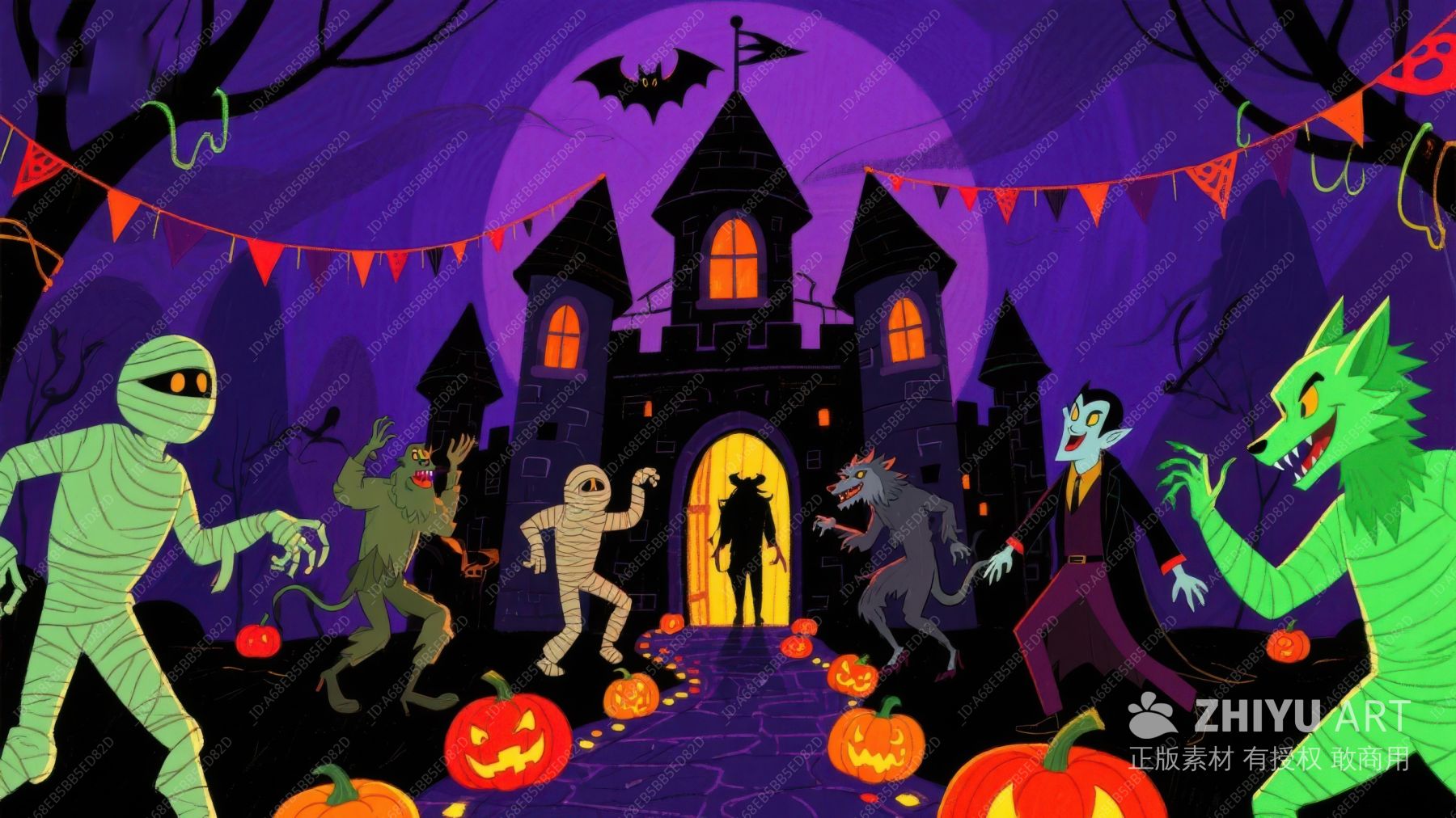 万圣节夜景:怪物们在城堡前狂欢