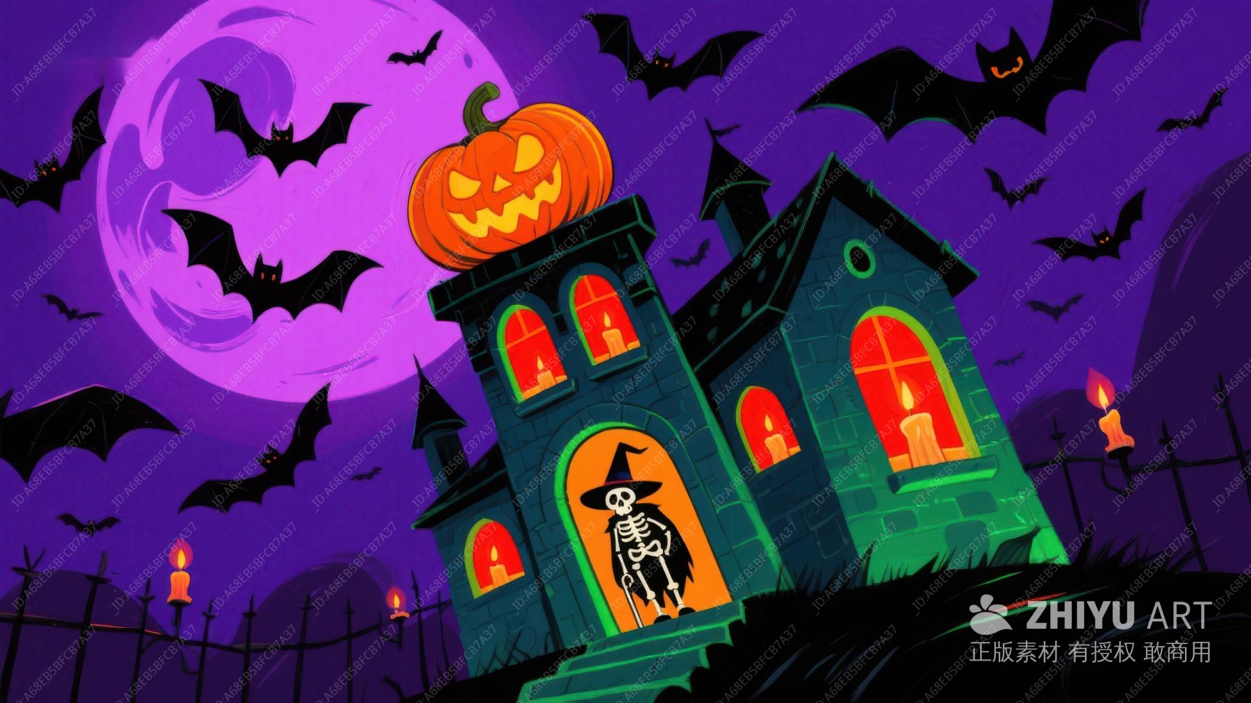 万圣节夜景:南瓜灯与幽灵蝙蝠