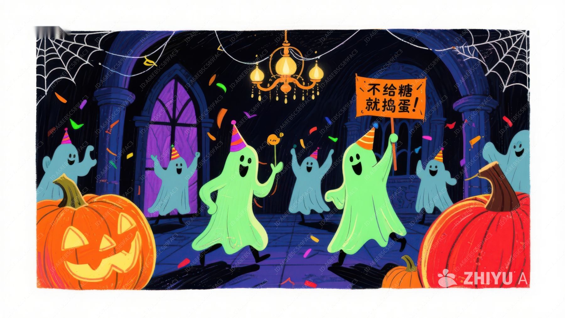 万圣节夜景:幽灵持牌,南瓜灯闪烁