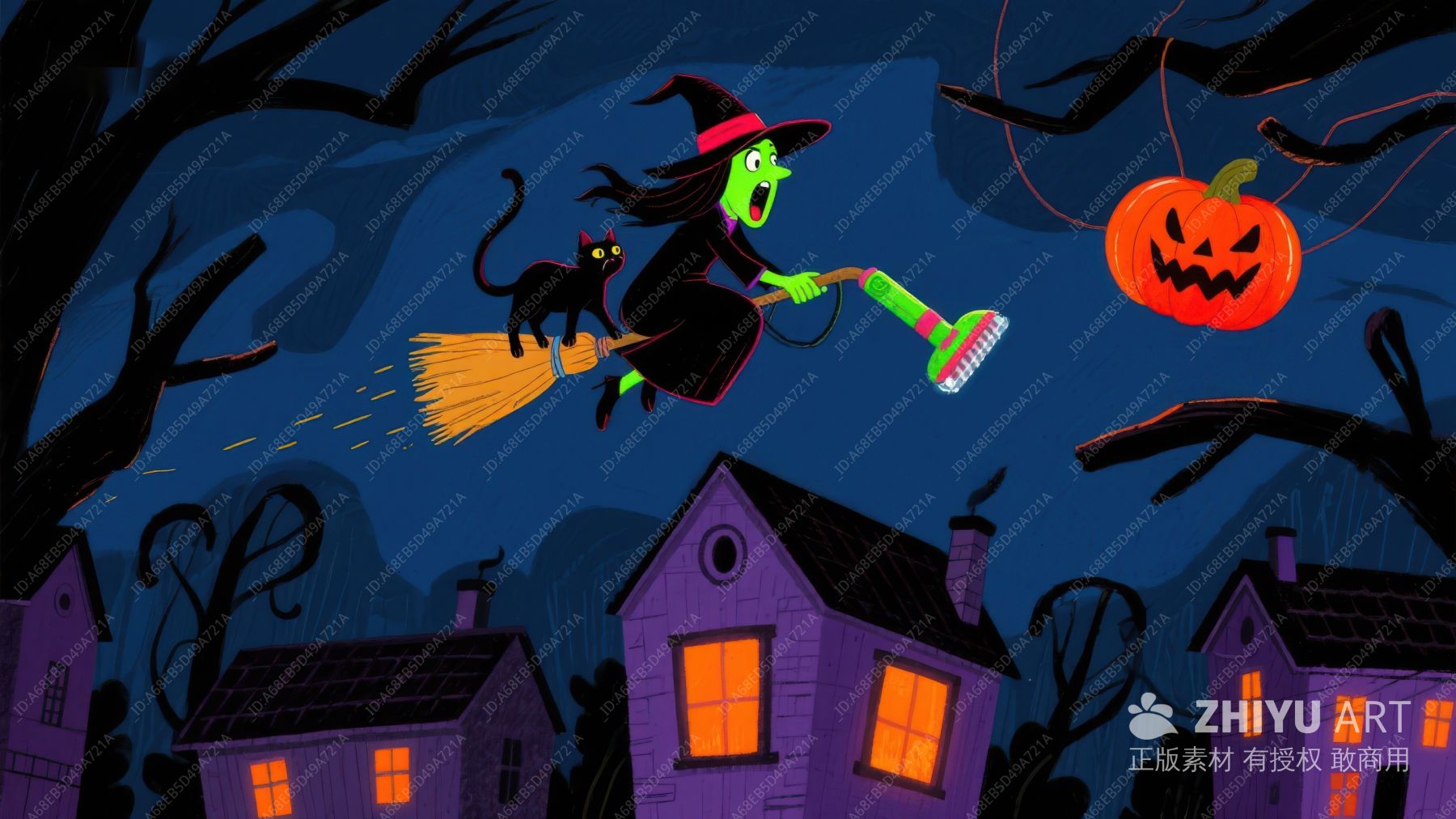 万圣夜巫女骑扫帚撒糖果