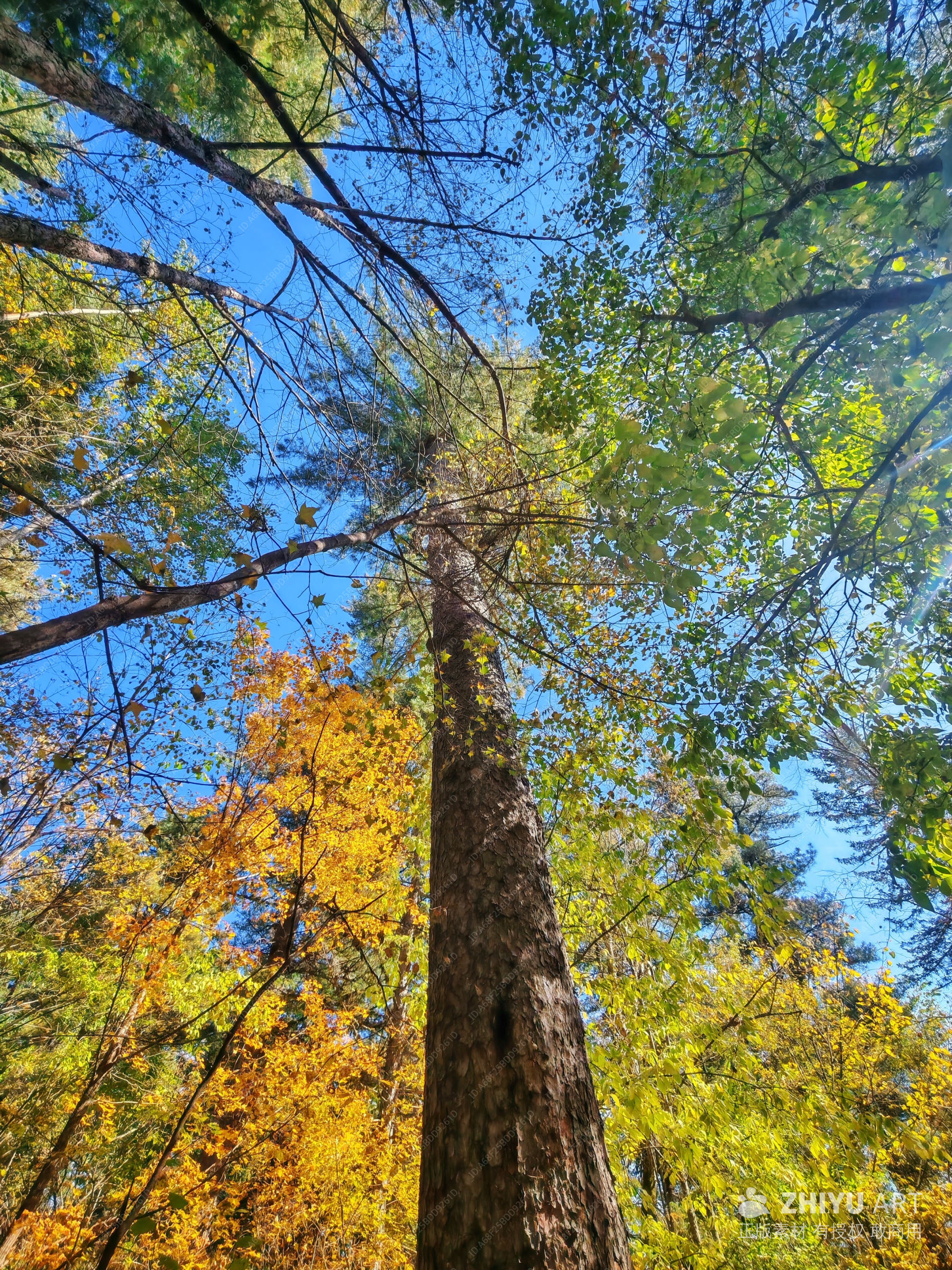 仰首望去,秋日的森林宛如一幅斑斓的织锦。挺拔的大树直指苍穹,粗糙的树干彰显着岁月的厚重。枝叶间,翠绿尚未褪尽,金黄已悄然蔓延,像是大自然打翻了调色盘,色彩交织碰撞。#秋日随手拍