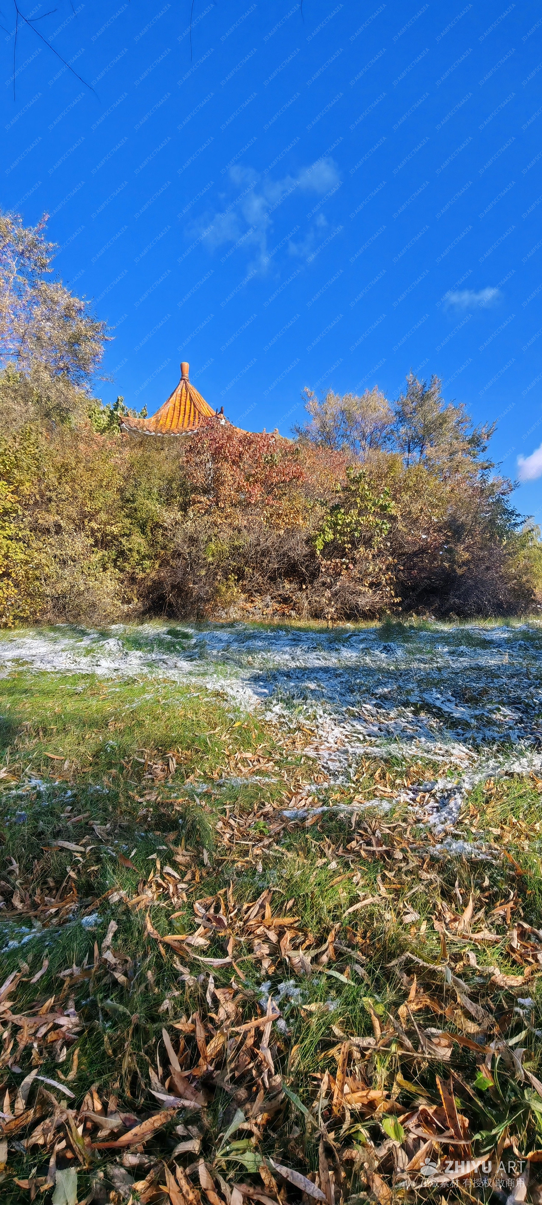 蓝天澄澈得像块透亮的宝石,几缕云丝轻轻飘着。草地上,枯黄的落叶与薄雪交织,像是秋与冬悄悄留下的信笺;灌木丛的枝叶杂着黄褐与橙红,还残留着秋的余温。一座红瓦翘檐的亭阁半藏在树影里,橙亮的屋顶在斑斓草木间格外醒目,仿佛从旧时光里走来的一角诗意。#秋日随手拍