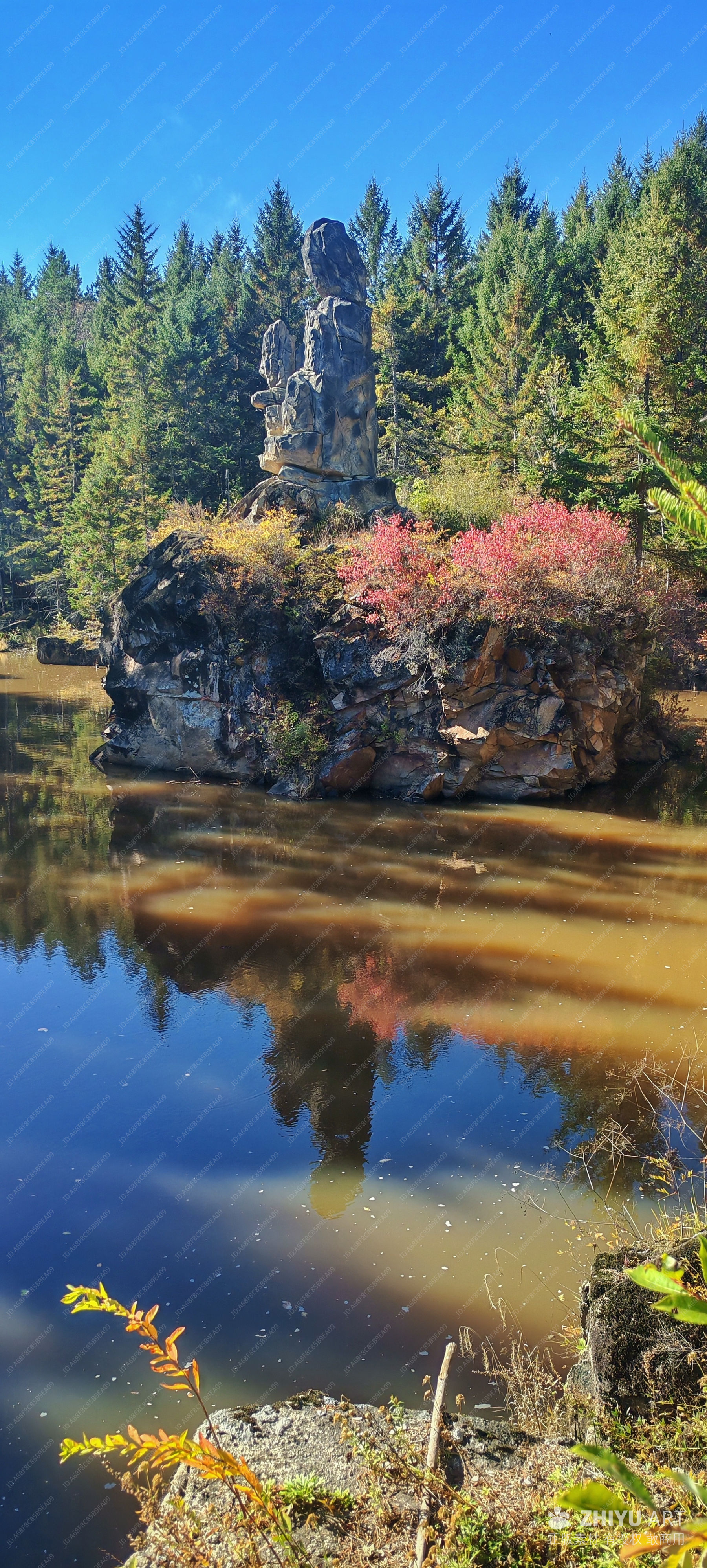 蓝天像块澄澈的水晶,把水潭与石峰衬得格外鲜明。湖心的巨石造型奇崛,像大自然亲手塑的雕像,周围深绿的松林做了背景,偏偏又有几簇艳红的灌木拥在石旁,像给石像披了件彩衣。#秋日随手拍