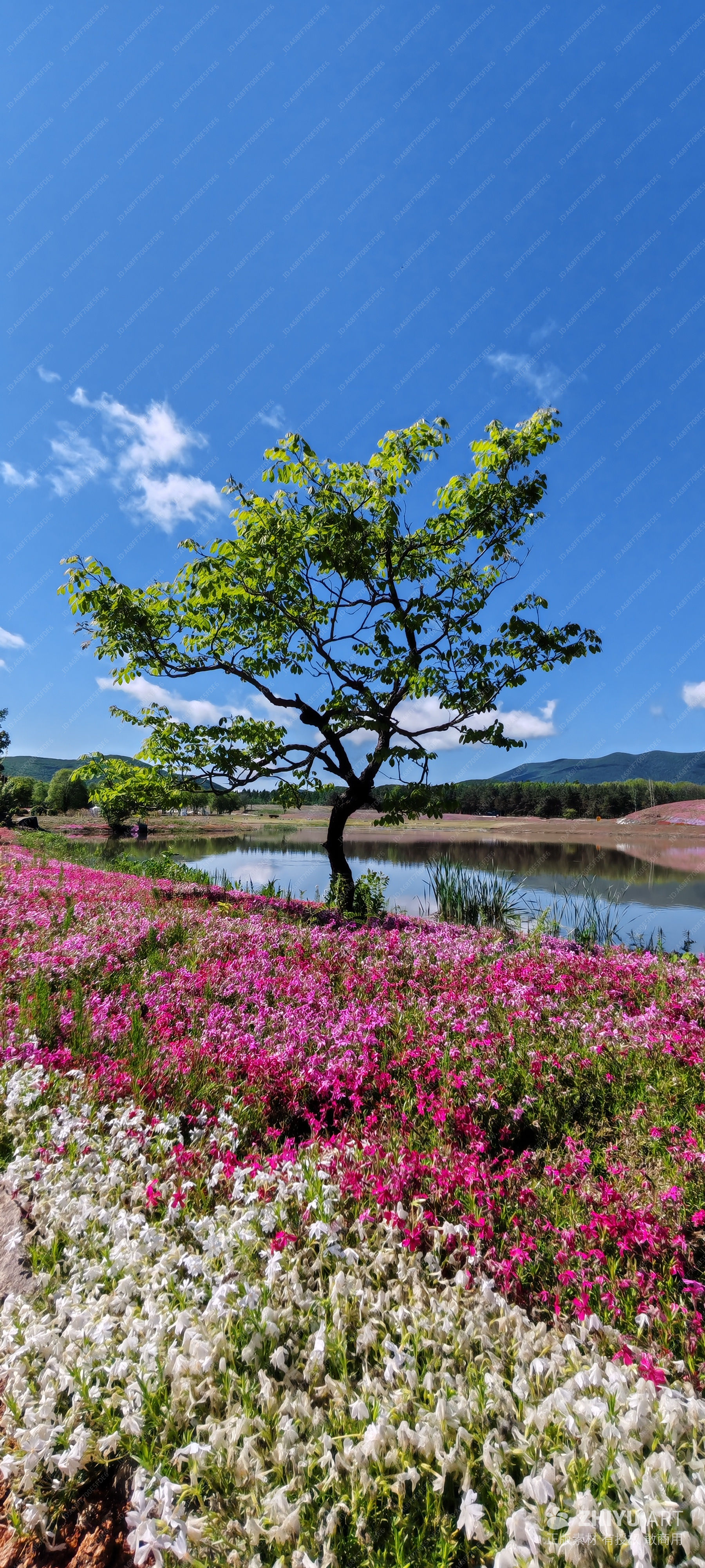 湛蓝的天空如洗,几朵白云悠然飘荡。湖畔,五彩斑斓的花海肆意铺展,粉色、白色的花朵交织成梦幻的地毯。一棵树木身姿挺拔,枝叶翠绿,静静伫立在花海与湖水之间。湖水澄澈,倒映着蓝天、绿树与花海,似是将这世间美好都收纳其中。远处,山峦连绵,绿意盎然。这般景致,是大自然馈赠的绝美画卷。#山川视界