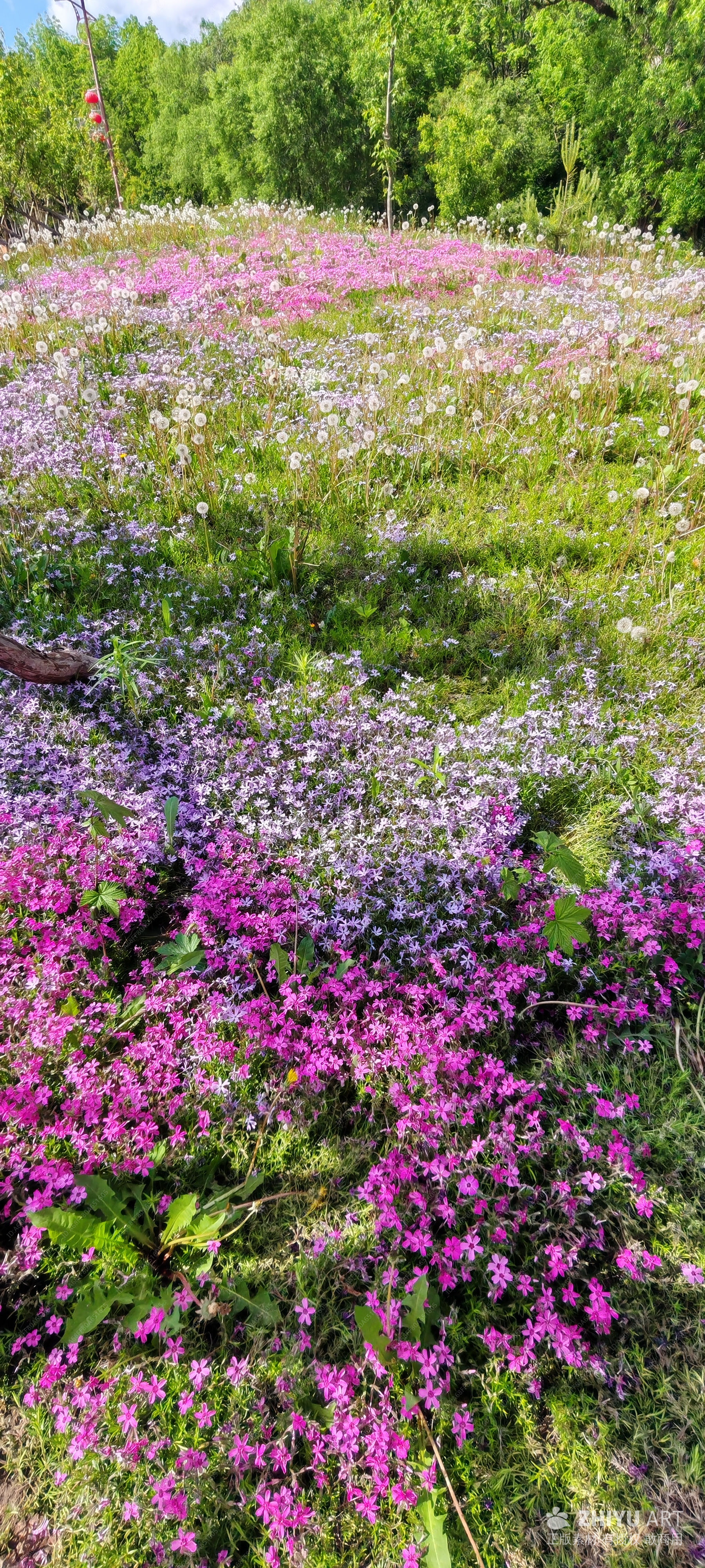这片花海宛如大自然打翻的调色盘,粉色、紫色、白色的花朵层层叠叠,肆意铺展在翠绿的草地上。蒲公英的白球点缀其间,似是给花海撒上了细碎的银霜。远处的树林郁郁葱葱,与这片绚烂的花境相映成趣。微风拂过,花枝摇曳,送来阵阵芬芳,仿佛一幅灵动的田园画卷,让人沉醉在这满是生机与浪漫的景致里。#山川视界