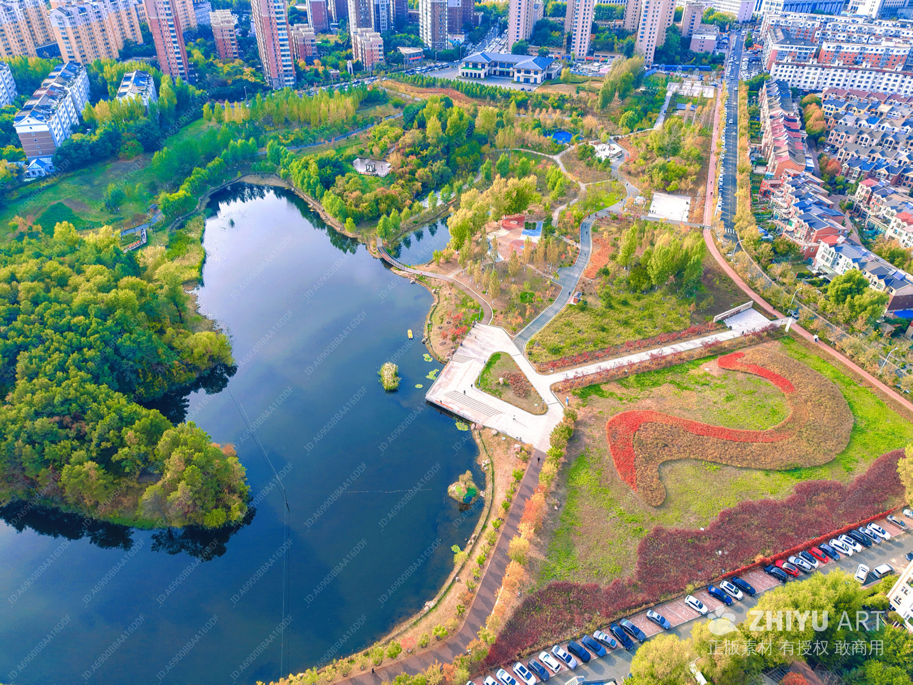 城市公园湖畔秋景