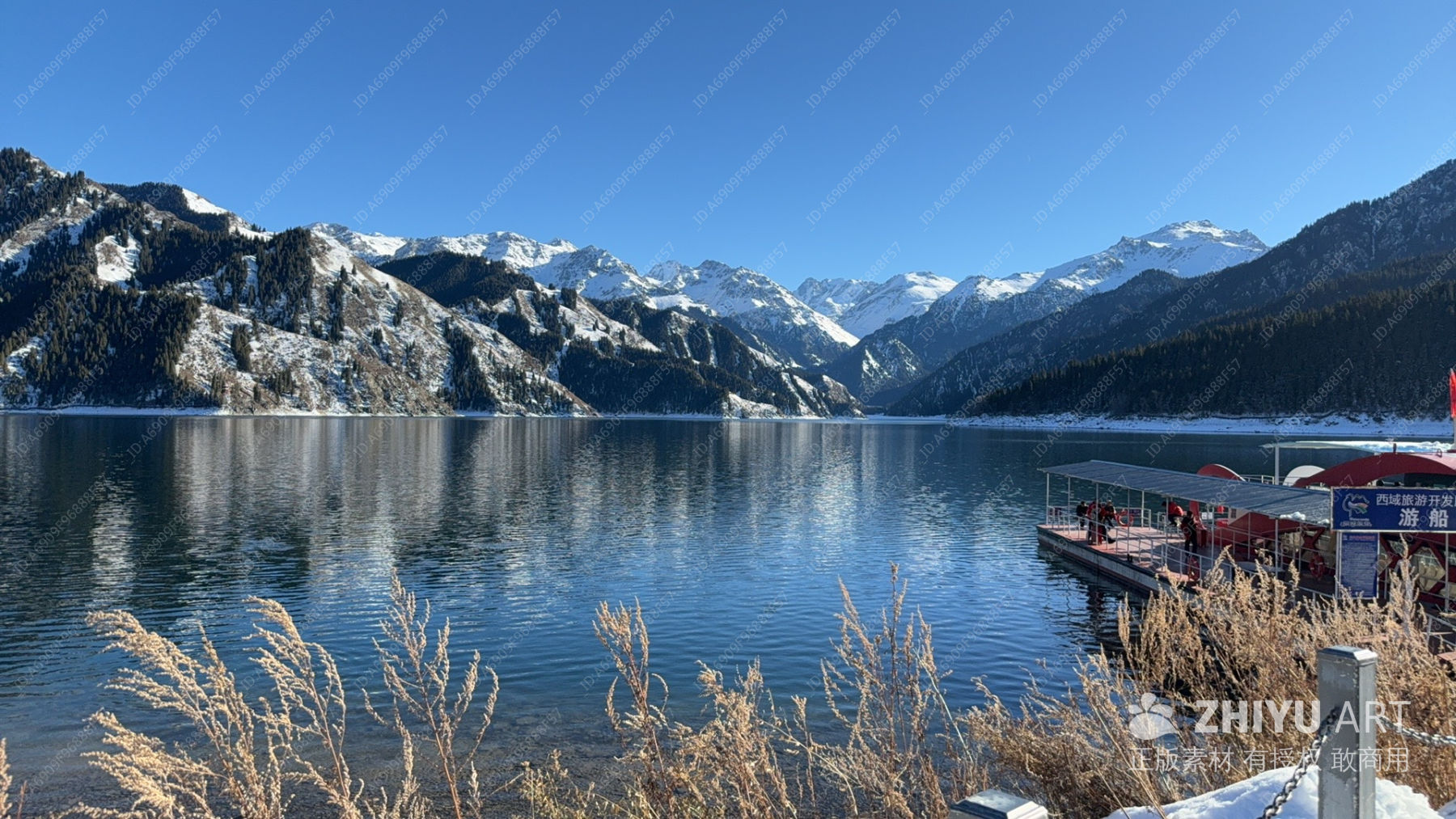雪山湖畔游船景