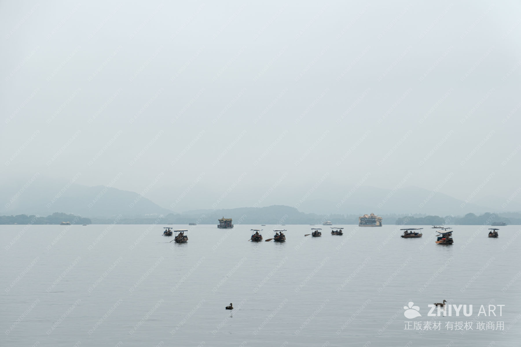 薄雾湖景,小舟悠然