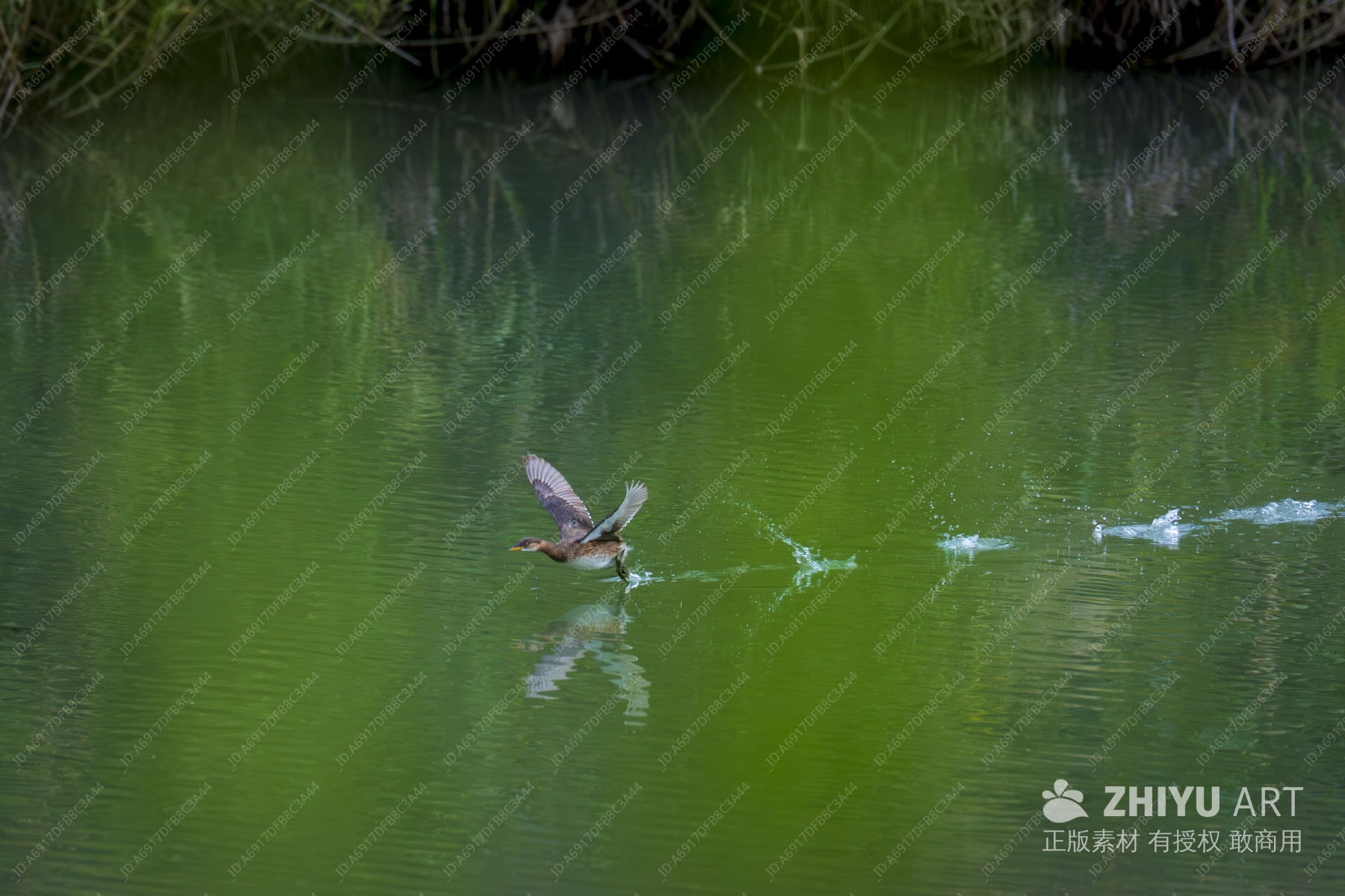 水鸟振翅掠过绿波