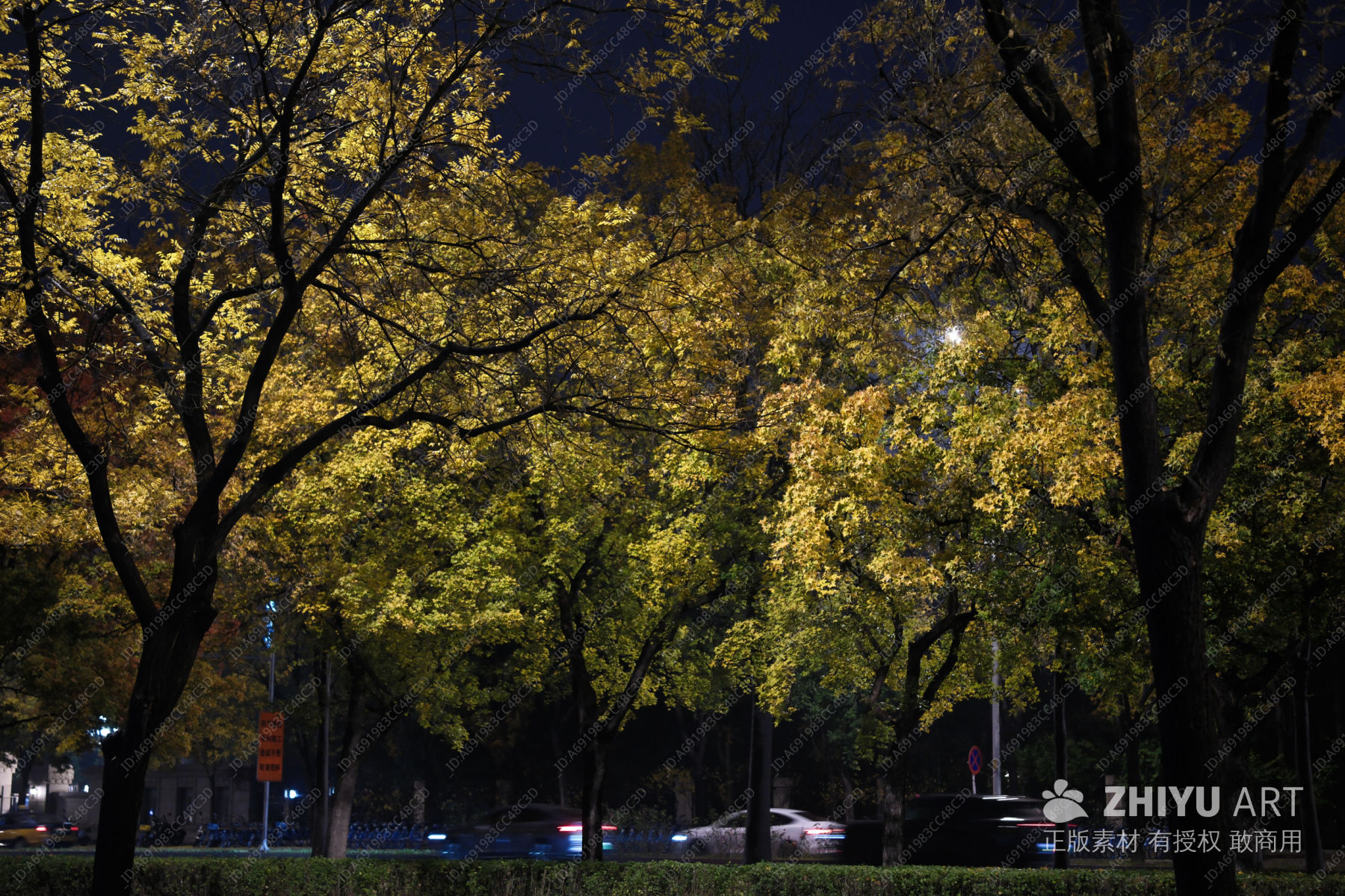 秋夜街景:金黄树叶与车灯