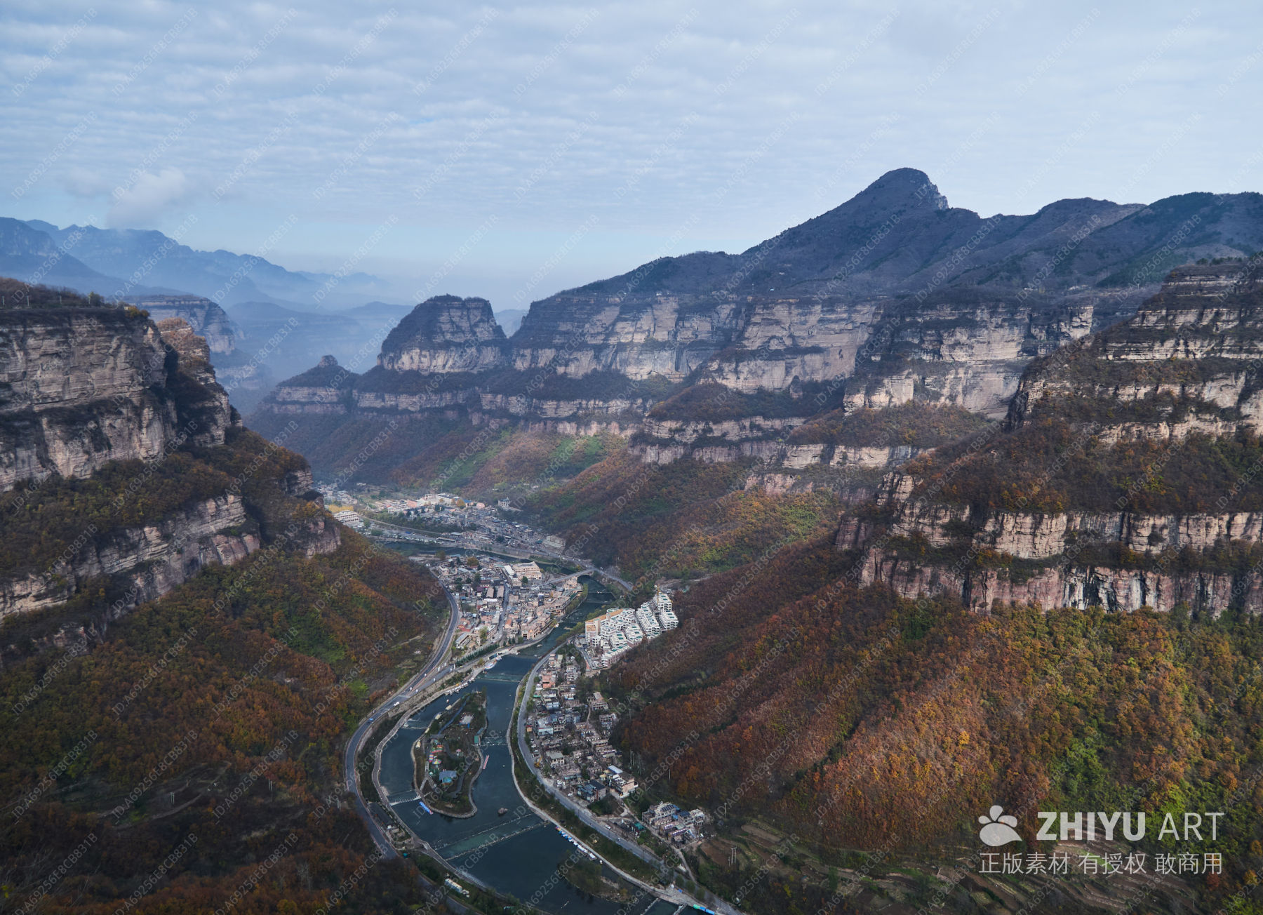 太行山脉层峦叠嶂峡谷河谷村落全景