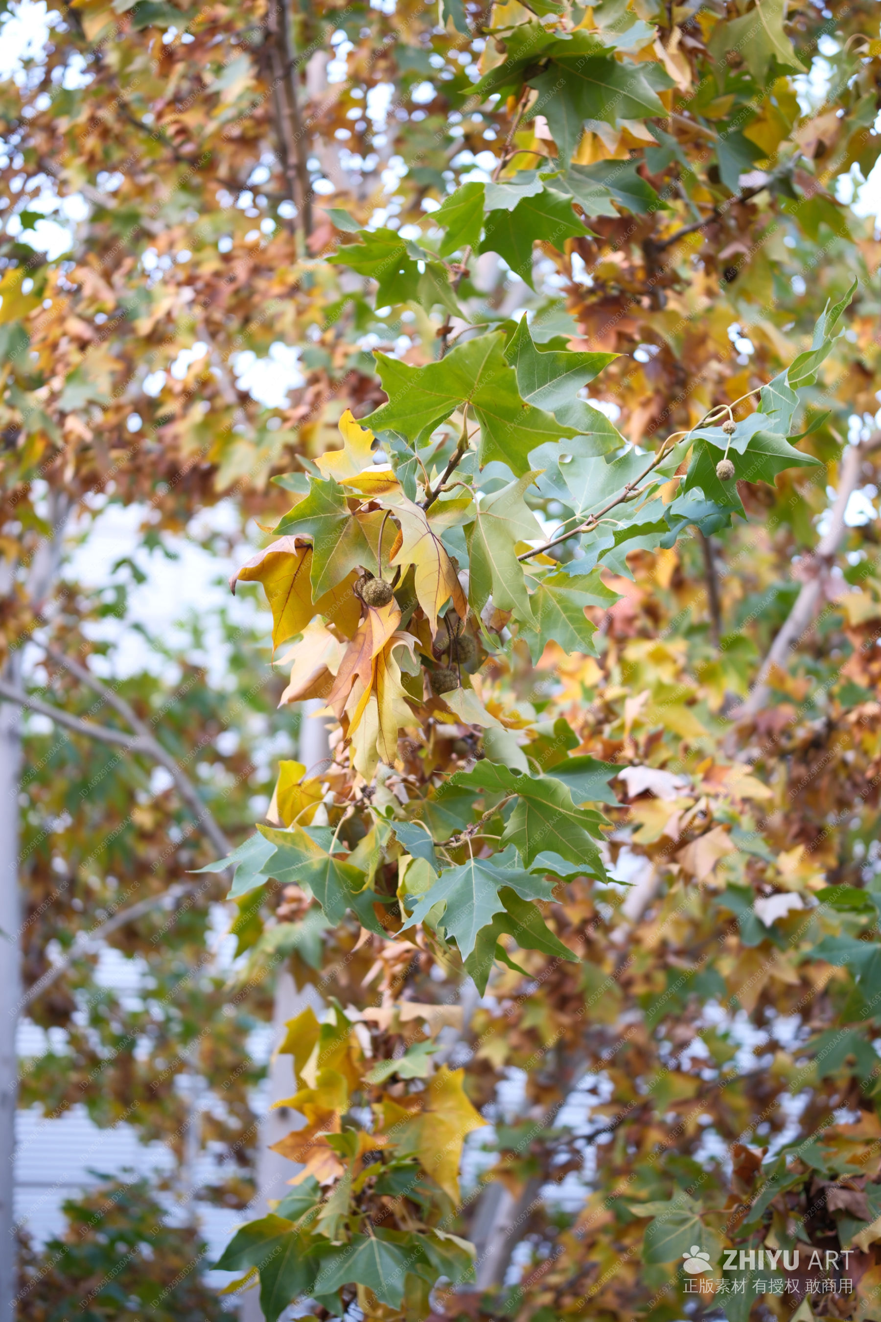 秋日绿黄交织的树叶