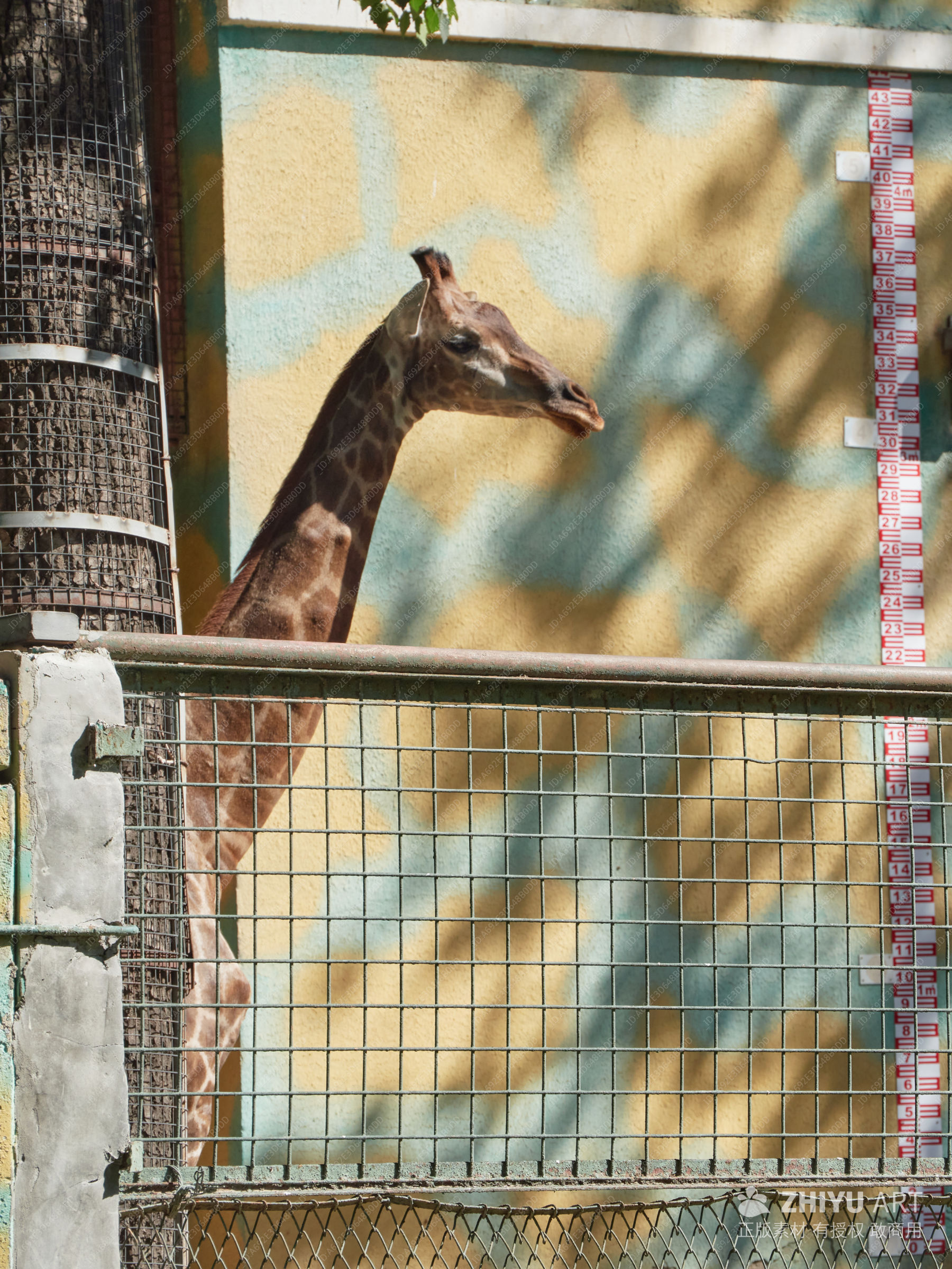 长颈鹿 动物园 围栏 身高测量 阳光 温暖 好奇 自然 教育 亲子 长颈鹿科 鹿 网格 光影 户外 场景 动物 特写 头部 哺乳动物 野生动物 圈养 生态 园区 环境 氛围 互动