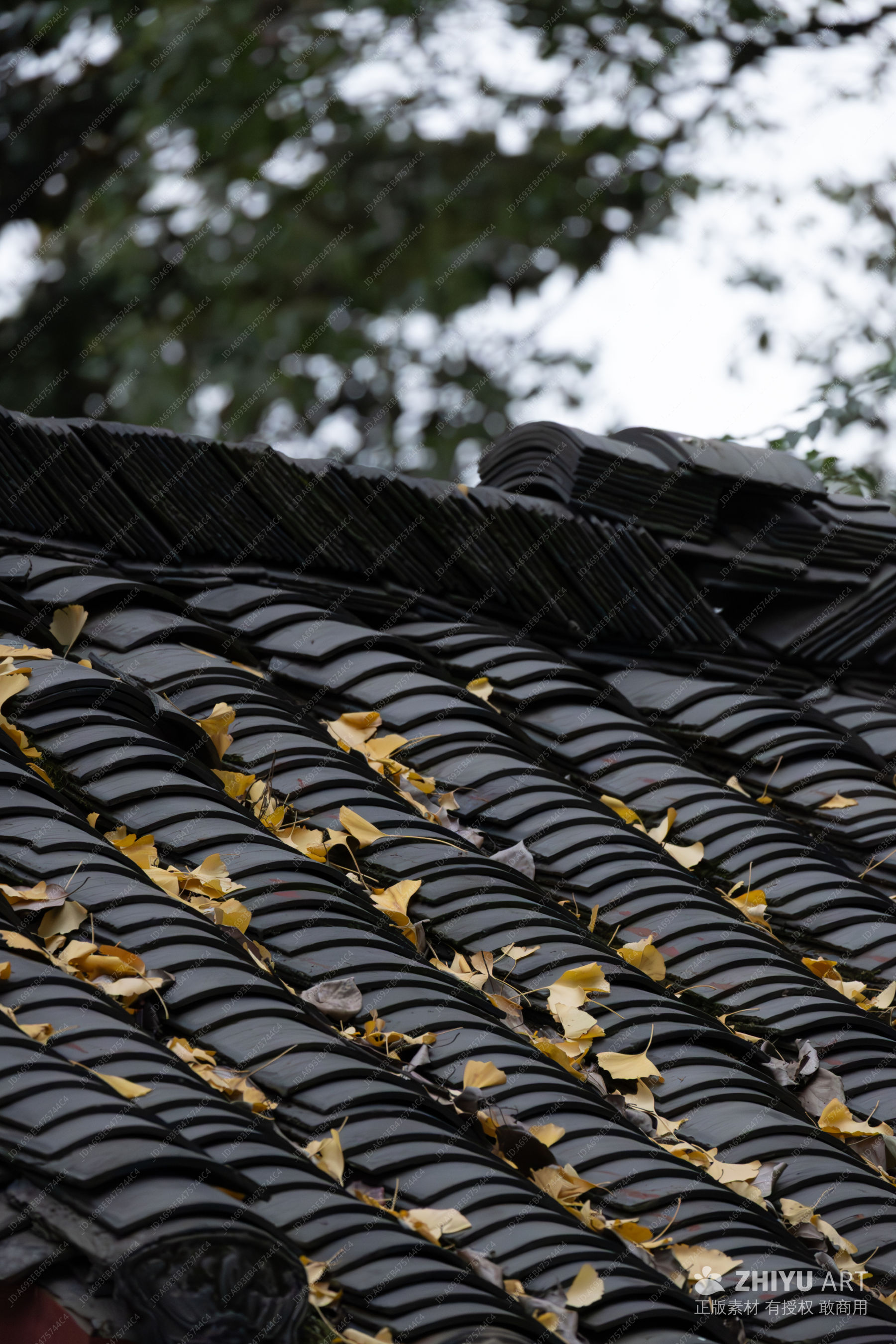 秋日瓦檐银杏叶