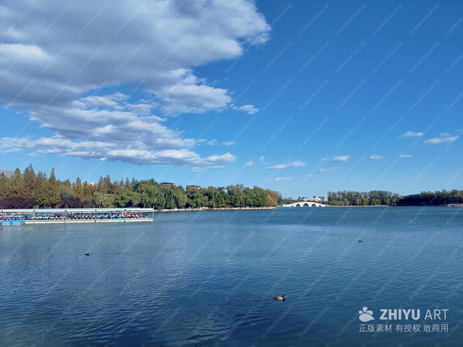 城市休闲湖景:蓝天湖水+游船码头+远处拱桥展示 #北京 #城市 #秋天 #旅行