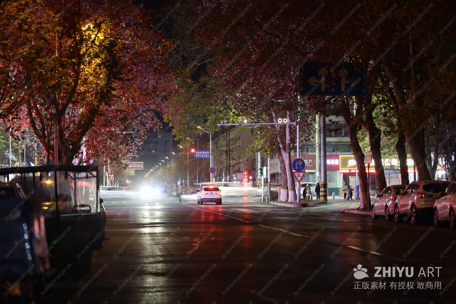 秋夜街景:金黄树叶与车灯
